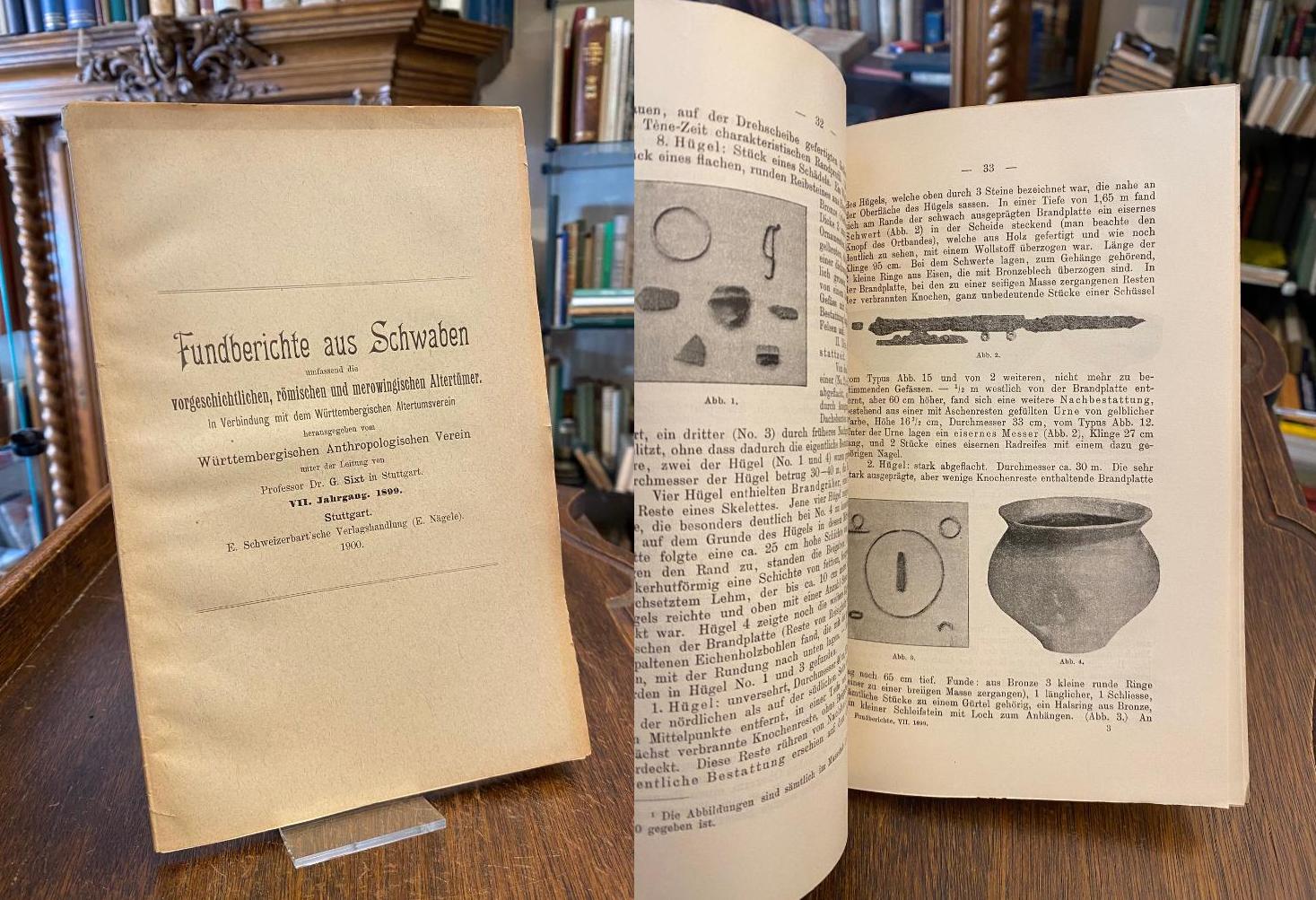Fundberichte aus Schwaben : 1899 : Jahrgang VII : umfassend die vorgeschichtlichen, römischen und merowingischen Altertümer. In Verbindung mit dem Württembergischen Altertumsverein herausgegeben vom Württembergischen Anthropologischen Verein und der Leitung von G. Sixt in Stuttgart. Stuttgart, E. Schweizerbart’sche Verlagshandlung (E. Nägele), 1900. 8° (24x15), 50 S., OKart (Brosch), unbeschnitten/unaufgeschnitten, offensichtlich ungelesen, enthält: Fundchronik vom Jahre 1899 von MAX BACH. S. 1-8. – Funde in Baden 1898 von E. WAGNER und K. BAUMANN. S. 8-10. – Typen-Statistik. S. 10-11. – Die Schwertformen Südwestdeutschlands von K. SCHUMACHER. (Mit 2 Tafeln Abbildungen.) S. 11-25. – Eine neolithische Wohnstätte bei Heilbronn von DR. SCHLIZ. (Mit 1 Situationsplan.) S. 25-30. – Untersuchung von Grabhügeln bei Marbach OA. Münsingen von G. SIXT. (Mit 16 Abbildungen.) S. 30-37. – Römische Statuetten von Wisent und Ur von E. FRAAS. (Mit 2 Abbildungen.) S. 37-40. – Bruchstück eines Reliefs von einem Mithrasdenkmal im Lapidarium Stuttgart von G. SIXT. (Mit 2 Abbildungen.) S. 40-42. – Funde antiker Münzen im Königreich Württemberg (und Hohenzollern), VII. Nachtrag, von W. NESTLE. S. 42-43. – Berichtigung von W. NESTLE. S. 40. – SALOMON REISEL’S Sammlung römischer Denkmäler von K. ZANGEMEISTER. S. 43-50. — Vorträge. S. 50. –