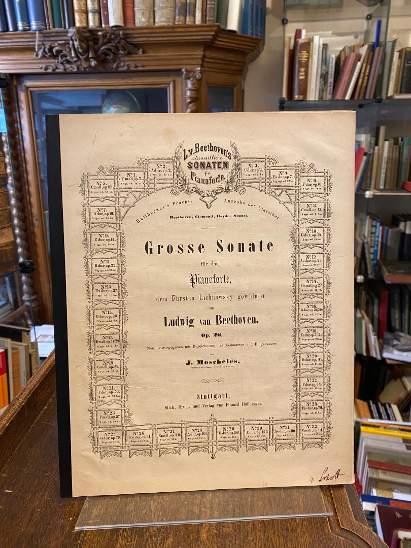 Beethoven, Ludwig van (1770-1824). – Moscheles, Iganz (Hrsg/Bearb): Grosse Sonate für das Pianoforte von Ludwig van Beethoven – dem Fürsten [Karl von] Lichnowsky gewidmet : Op. 26 : [Sonate No in 12 As dur]. Neu herausgegeben mit Bezeichnzung des Zeitmasses und Fingersatztes von I. Moscheles. Stuttgart, Stich, Druck und Verlag von Eduard Hallberger, (VN B XII [1858]. 4° (33x26), 19 S., OKart (Brosch), Heftstreifen, mit Schmucktitel, schönes gepflegtes Exemplar, [= L. v. Beethovens sämmtliche Sonaten für das Pianoforte : Hallberger’s Pracht-Ausgabe derr Classiker Beethoven, Clementi, Hays, Mozart],