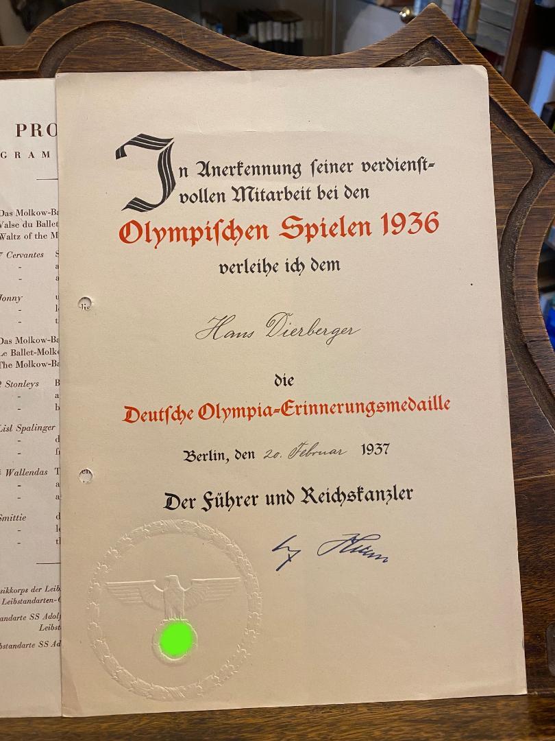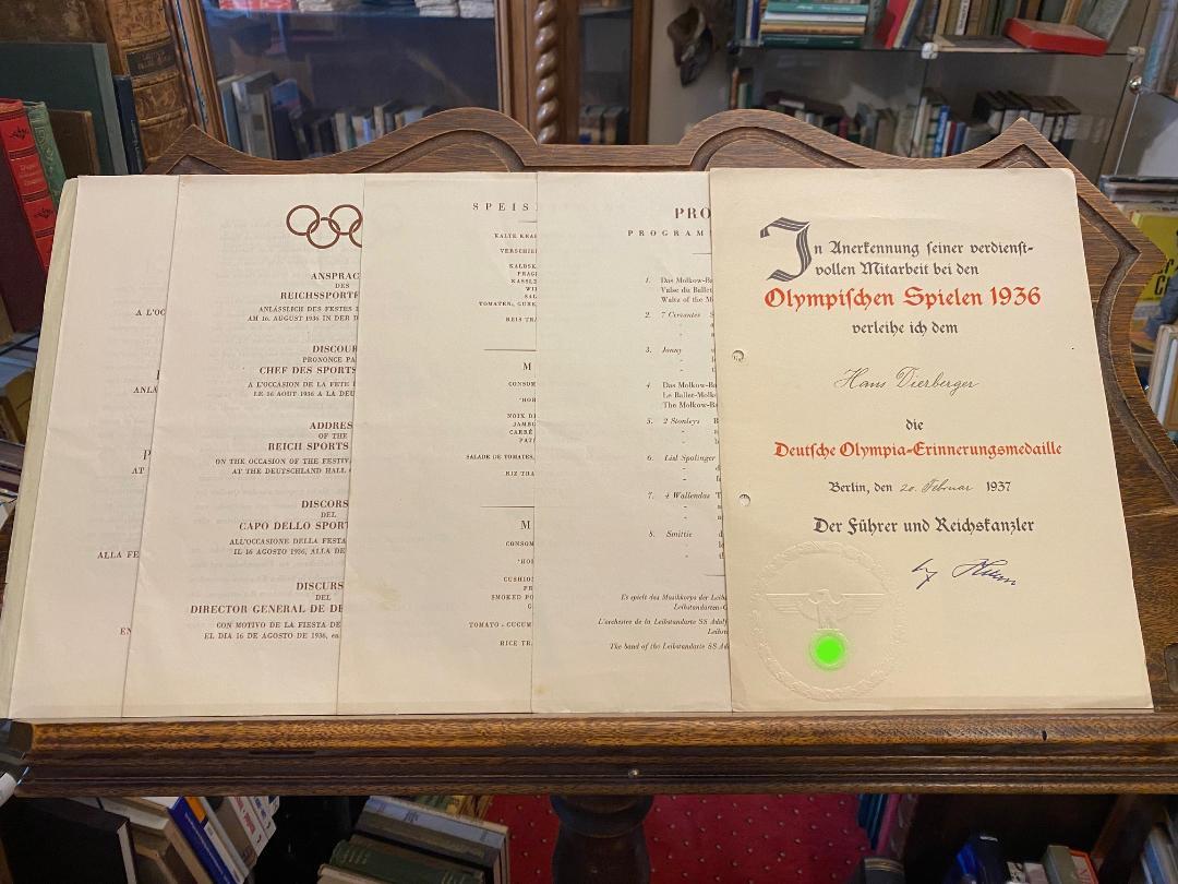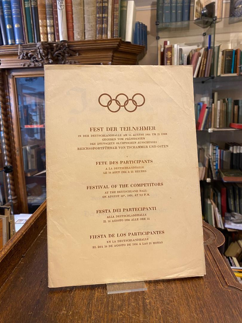 Fest der Teilnehmer in der Deutschlandhalle am 16. August 1936 um 21 Uhr gegeben vom Präsidenten des Deutschen Olympischen Ausschusses, Reichssportführer von Tschammer und Osten / Feste des Participants / Restival of the Competitors / Feste dei Partecipanti / Fiesta de los Participantes … . Berlin, 1936. 4° (26x19), 11 S. Ansprache des Reichssportführer (in 5 Sprachen); 6 S. Ansprache des Präsidenten des O.O.K. anlässlich des Festes; 1 Bl. Speisenfolge (Menuekarte in 3 Sprachen), 1 Bl. Programm (in 3 Sprachen), OKart (Brosch) Umschlag mit lose eingelegten Blättern, Umschlag leicht knittrig und gering angeschmutzt, schöne gepflegte Erhaltung, enthält im Einzelnen: