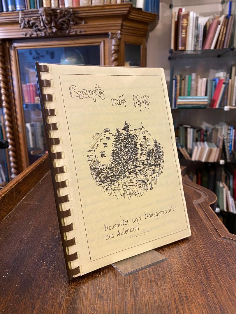 Aulendorf. – Utz, Pfarrer Joseph (Vorwort): Rezepte mit Pfiff : Hausmittel und Hausgemachtes aus Aulendorf. Die Rezepte wurden zusammengestellt vom Kath. Frauenbund und den Schönstatt-Mütern von Aulendorf. Zeichnungen: Karl Braunger. Aulendorf, (Katholische Kirchengemeinde), [1988]. 8°, 2 Bl., 88 S., 3 Bl., in verschiedenen Handschriften gedruckt, OKart (Brosch) mit Ringbuchheftung und Klarsichtschutzblätter, geringe Gebrauchsspuren, gutes Exemplar, Teemischungen.– Hausmittel.– Herzhaft Pikantes.– Süß-Saures.– Getränke.– Marmelade.– Süßigkeiten.–