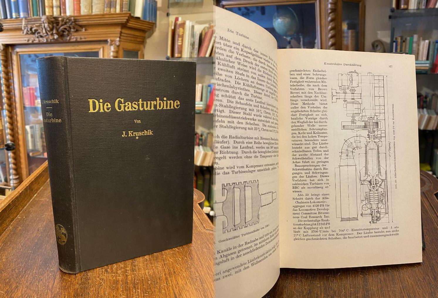 Kruschik, [Julius]: Die Gasturbine : Ihre Theorie, Konstruktion und Anwendung für stationäre Anlagen, Schiffs-, Lokomotiv-, Kraftfahrzeugt- und Flugzeugantrieb. (1. Aufl.), Wien, Springer Verlag, 1952. 8° (23x16), X, 469 S., mit 153 TextAbb., 67 Tab., 9 Rechnentafeln, schwarzer Oln gewachst mit goldTitel, Name auf Vorsatz, Namensstempel auf Titel, kaum genutzt, fest sauber und gepflegt,