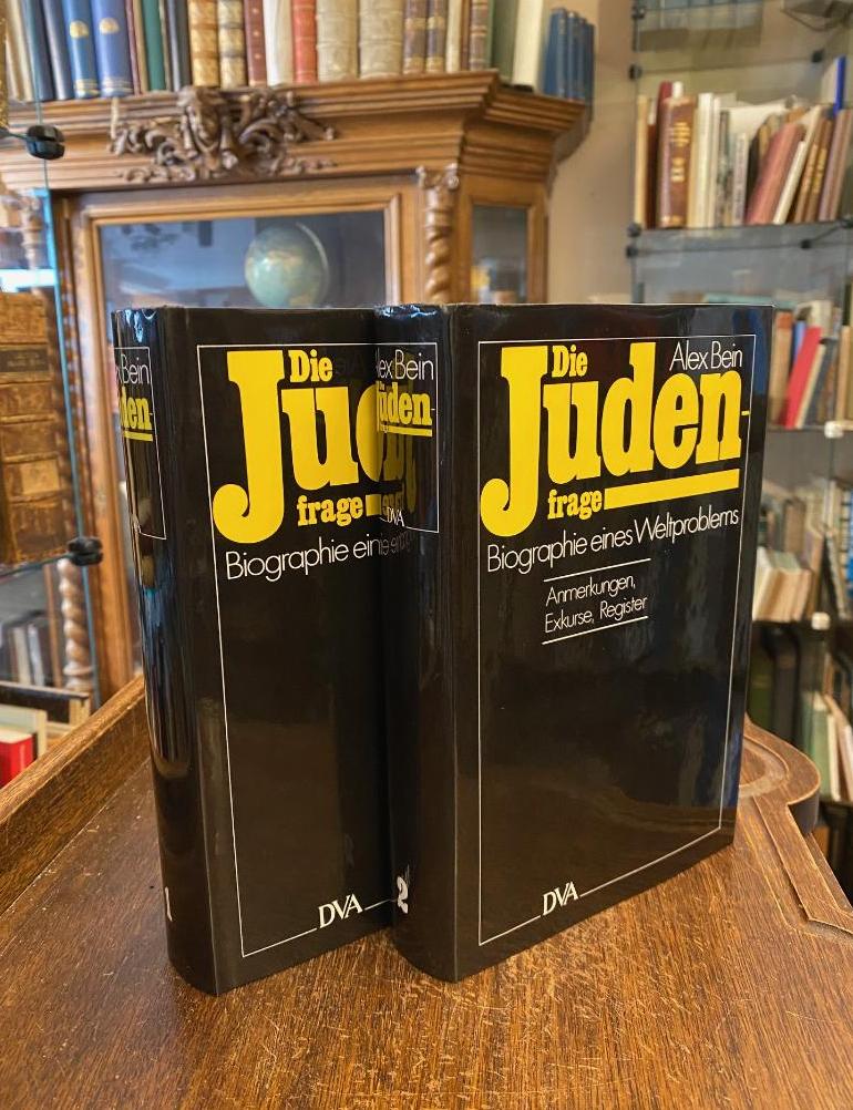 Bein, Alex: Die Judenfrage : Biographie eines Weltproblems [in zwei Bänden]. 2 Bände in 2 (so komplett), Stuttgart, DVA Deutsche Verlags-Anstalt, 1980. 8° (22x15), XVI, 464; VII, 429 (Anmerkungen, Exkurse, Register) S., OPbde mit OU, ohne Gebrauchsspuren, offensichtlich ungelesen,