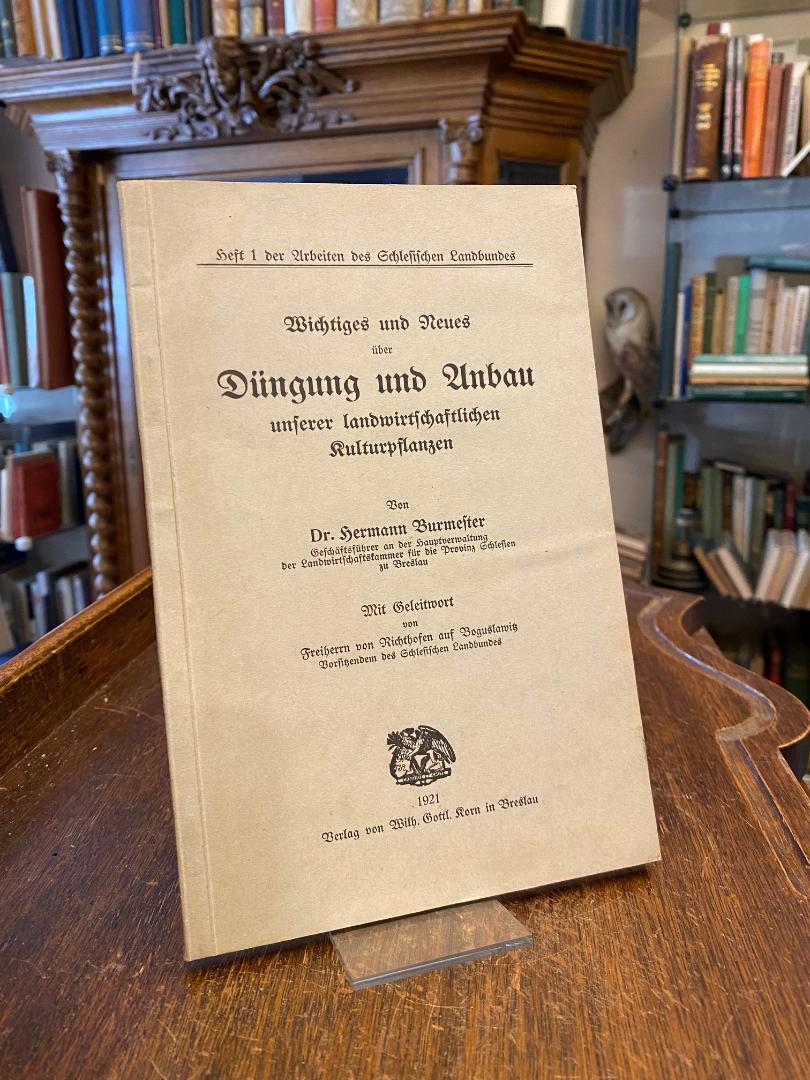 Burmester, Hermann ( Geschäftsführer an der Hauptverwaltung der Landwirtschaftskammer für die Provinz Schlesien zu Breslau): Wichtiges und Neues über Düngung und Anbau unserer landwirtschaftlichen Kulturpflanzen. Mit Geleitwort von Freiherr von Richthofen auf Boguslawitz, Vorsitzendem des Schlesischen Landbundes. Breslau, Verlag von Wilh. Gottl. Korn, 1921. 8° (22x15), VIII, 116 S., mit vereinzelten Abb., OKart (Brosch), nahezu ungelesen, schönes gepflegtes Exemplar, [= Arbeiten des Schlesischen Landbundes; 1],