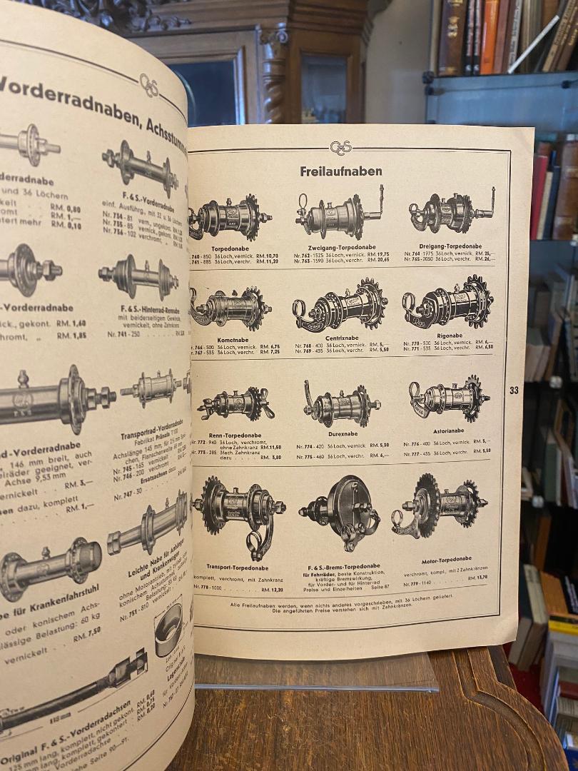 Greif & Schlick, Coburg (Hrsg): Fahrrad-Teile-Katalog Nr. 506 – Ausgabe 1939 : [Jubiläumskatalog 60 Jahre 1879 – 1939]. Coburg, Greif und Schlick : Grosshandelshaus, 1939. 4° (31x24), 152 S., reich illustriert, mit Preisangaben, rote OKart (Brosch) mit Titeldruck, Kordelschlaufe zum Aufhängen, die ersten 2 Blatt mit kleiner säurefrei reparierten Verletzung, sonst sehr schön, kaum genutzt,