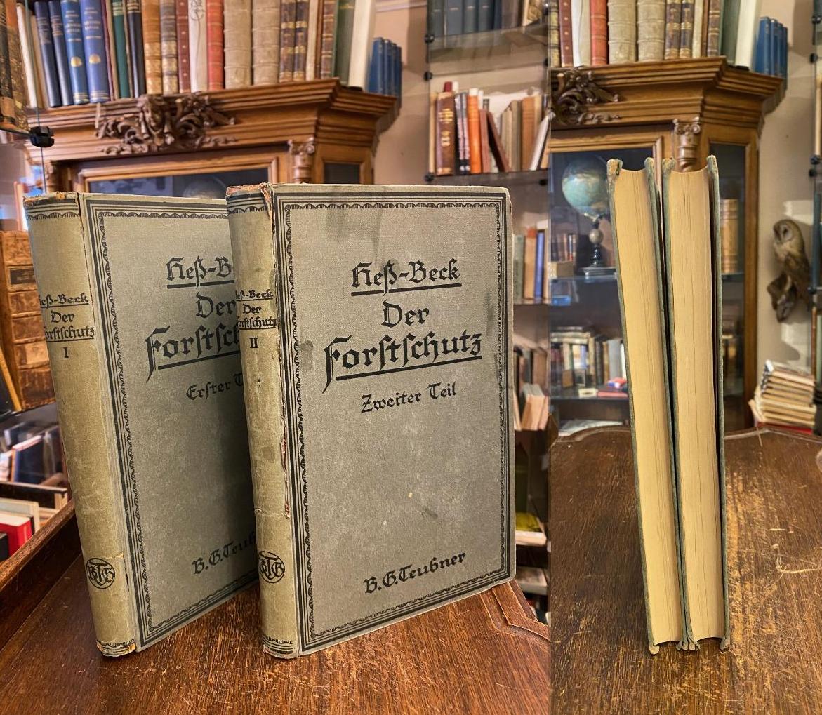 Heß, Richard / Beck, Richard: Der Forstschutz : Ein Lehr- und Handbuch von Richard Heß [in zwei Bänden]: Erster Band: Schutz gegen Tiere.– Zweiter Band: Schutz gegen Menschen, Gewächse und atmosphärische Einwirkungen. Vierte Auflage völlig neu bearbeitet von R. Beck. 4., vollständig neu bearbeitete Aufl., 2 Bände in 2 (so komplett), Leipzig und Berlin, Verlag von B. G. Teubner, 1914 – 1916. 4° (26x18), BAND 1: XIII, 537 S., 2 Bl., mit Porträtfrontispiz, 250 Abb., 1 farb Falttafel.– BAND 2: X, 4616 S., 3 Bl., mit 133 Abb., 1 fotograf Tafel, einheitl OPbde, etwas berieben, Rücken nachgeleimt, Name auf Vorsatz, innen sauber und wohlerhalten,