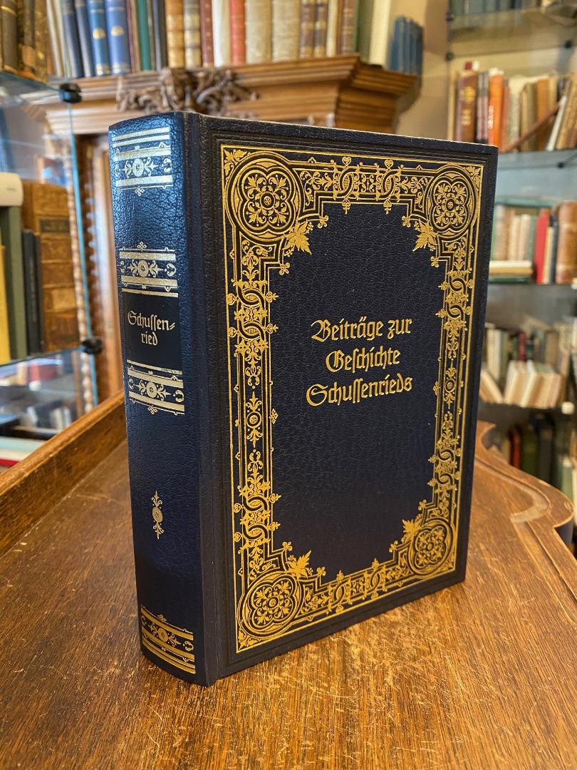 Schussenried, Bad. – Beck, Paul/ Ruess, Bernhard: Beiträge zur Geschichte Schussenrieds. Bad Buchau, Federsee-Verlag, (1981). 8° (21x14), 720 S., mit umfangreichem Bildmaterial, blauer OKldr mit reicher goldPräg, 1 kleine Randmarkierung, sonst sehr schön, Zusammenfassende Übersicht über die Geschichte von Schussenried, enthaltend die wichtigen Veröffentlichungen von Bernhard Rueß und Paul Beck, ergänzt durch einen Bildteil und eine Schussenried-Bibliographie vom derzeitigen Stadtchronisten Karl Kaufmann.–