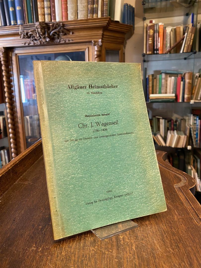 Wagenseil Christian Jakob (1756-1839). – Schmid, Hansheinrich: Chr. J. Wagenseil 1756 – 1839 : (Ein Beitrag zur Literatur- und Geistesgeschichte Süddeutschlands). Kempten, Verlag für Heimatpflege, 1959. 8° (21x15), 152 S., OKart (Brosch), Umschlag foliert und lichtverfärbt, Titelblatt verso mit Büchereistempel, Papier gebräunt, fest und sauber, [= Allgäuer Heimatbücher; 61 / Dissertation LMU München Philosophische Faktultät, 1958], mit Wagenseil Bibliographie.–