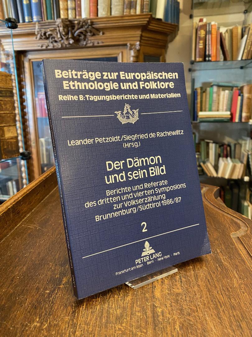 Petzoldt, Leander / Rachewiltz, Siegfried de (Hrsg): Der Dämon und sein Bild : Berichte und Referate des dritten und vierten Symposions zur Volkserzählung, Brunnenburg/Südtirol 1986/87. Frankfurt/M u.a.. Peter Lang : Internationaler Verlag der Wissenschaften, (1989). 8° (21x15), 203 S., mit Abb. und KartenSkizzen, OKart (Brosch), sauber und wohlerhalten, auf Titelblatt von Leander Petzold signiert, [= Beiträge zur Europäischen Ethnologie und Folklore : Reihe B (Tagungsberichte und Materialien); 2 : herausgegeben von Leander Petzoldt], Seit einigen Jahren rückt das Bild in den Mittelpunkt des wissenschaftlichen Interesses, weniger als illustratives Moment und Ergänzung zum Text, denn als Quelle, deren Aussage den Text interpretiert oder die zumindest neue Aspekte zur Genese und Interpretation des Textes beibringt. Hier wird der Versuch gemacht, Bildzeugnisse zu einem speziellen Bereich der Volkserzählung, nämlich der dämonologischen Sage, auf ihren Aussagewert hin zu überprüfen. Im interdisziplinären Gespräch setzen sich Erzählforscher, Historiker, Psychologen und Religionsethnologen mit Problemen der historischen und gegenwärtigen Volkserzählung und ihren ikonographischen Parallelen auseinander. Somit lässt sich der ikonographische Aspekt als übergeordnete Thematik dieses Bandes bezeichnen, ein Aspekt, der mit dem in der Europäischen Ethnologie festzustellenden Trend zu einer Aufwertung des Bildlichen, zur Bild-Lore, korrespondiert. (Verlag)