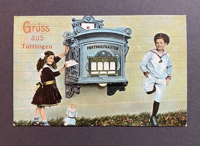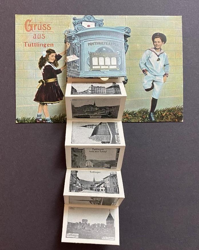 AK 78532 Tuttlingen. – Leporello-Karte. – Gruss aus Tuttlingen : Mädchen, Bub und Puppe am Briefkasten, der sich öffnen läßt und ein Ansichten-Leporello freigibt : ungelaufen. Rudolstadt, Aug. Heinecke Kunstanstalt, 1910. 12°quer (14x9),
