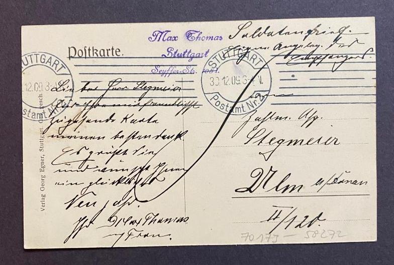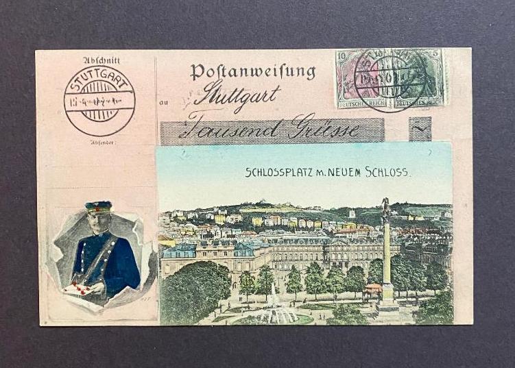AK 70173 Stuttgart : Postanweisung Stuttgart – Tausend Grüsse : mit Ansicht Schlossplatz m. Neuem Schloss, Briefträger eingedruckte Briefmarken : gelaufen 30. Dezember 1909. Stuttgart, Verlag Georg Egner, [um 1900]. 12°quer (9x14),