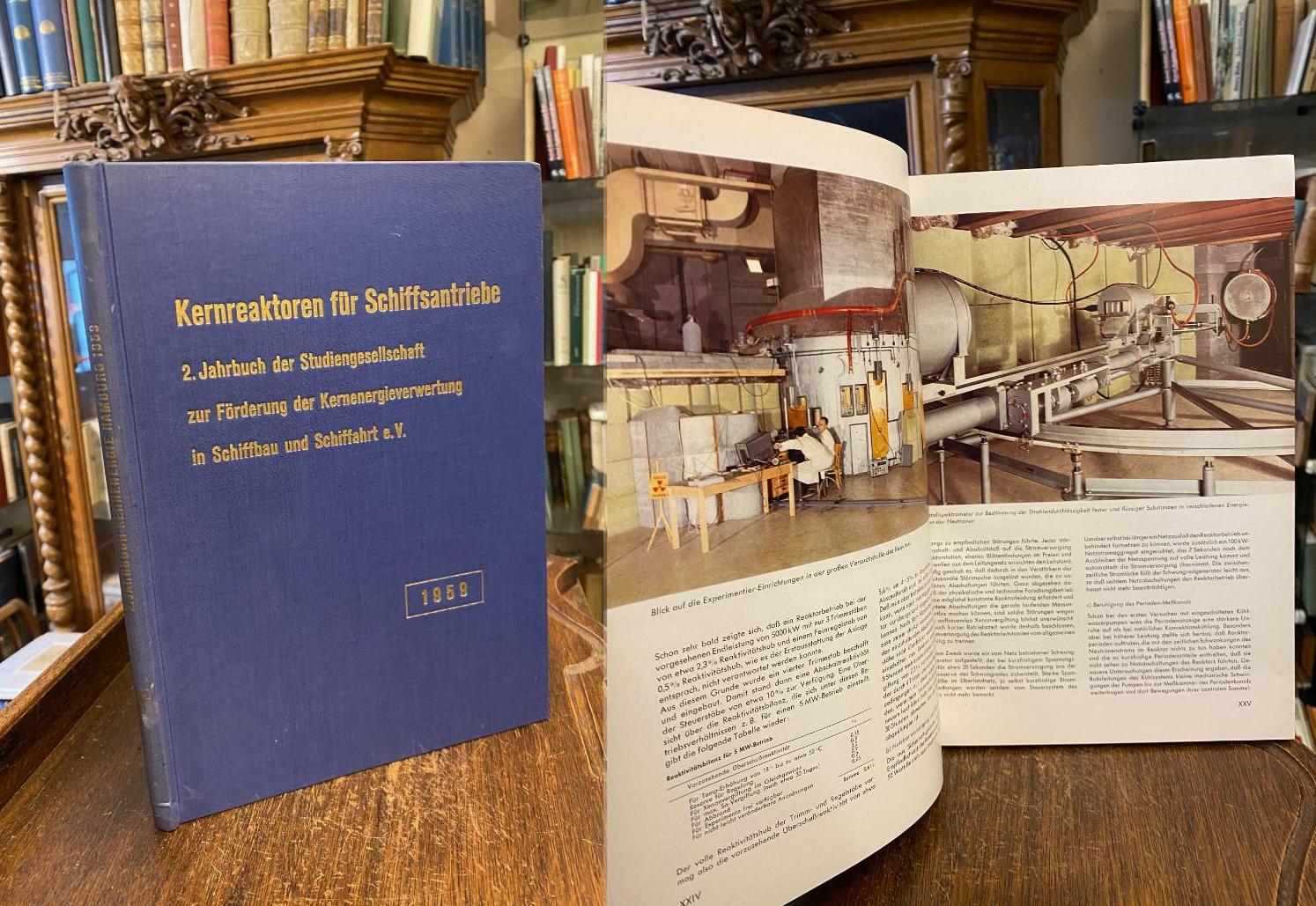 Bagge, [Erich] / Scholvin, [Johann]: Kernreaktoren für Schiffsantriebe : 2. Jahrbuch Der Studiengesellschaft zur Förderung der Kernenergieverwertung In Schiffbau und Schifffahrt e. V. 1959 / 2. Reaktortagung]. München, Verlag Karl Thiemig, 1961. 4° (30x22), XXXi, 156 S., mit zahlr. fotograf Aufnahmen und graph. Darst., blauer Oln gewachst mit goldTitel, sauber und wohlerhalten, [= Jahrbuch der Studiengesellschaft zur Förderung der Kernenergieverwertung in Schiffbau und Schiffahrt e. V.; 2],