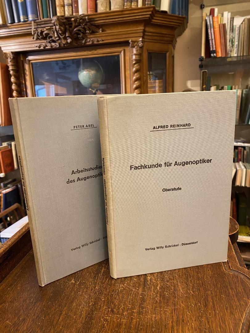 Reinhard, Alfred: Fachkunde für Augenoptiker – Oberstufe : Fachkunde – Fachrechnen – Fachzeichnen – Fachaufgaben. 3. erweiterte Aufl., Düsseldorf, Verlag Willy Schrickel, 1969. 8° (23x16), 211 S., mit 174 Abb., 280 Aufgaben und Wiederholungsfragen und 65 Aufgabenbeispiele, Oln mit TitelPrägung, Einband etwas lichtverfärbt, Papier leicht gebräunt, sauber und wohlerhalten, dazu: Aberl, Peter: Arbeitsstudien des Augenoptikers : Mit Anleitungen zur Führung des Werkstattwochenbuches.– Düsseldorf, Verlag Willy Schrickel, 1966.–