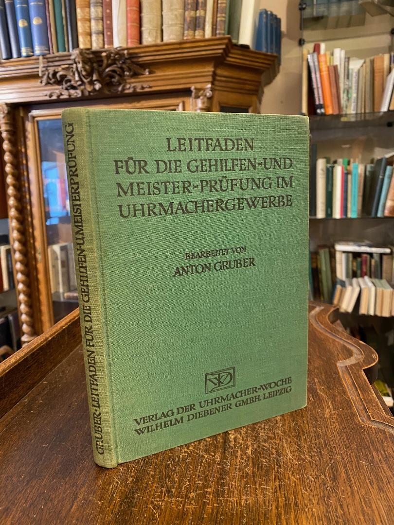 Gruber, Anton: Leitfaden für die Gesellen- und Meisterprüfung im Uhrmacherhandwerk : Ein Vorbereitungsbuch für die Gesellen- und Meisterprüfung. Leitfaden zum Gebrauch an den Uhrmacher-Berufsschulen und zum Selbstunterricht. 4. Aufl., Stuttgart, Rühle-Diebener-Verlag, (1935). 8° (23x17), 192S., mit 9 TextAbb., Deckelschlaufe und 4 Zeichentafeln, grüner Oln mit TitelPrägung, Name auf Vorsatz, sauber und wohlerhalten, Deckeltasche mit Meisterprüfungsordnung der Handwerkskammer der Pfalz 1956,