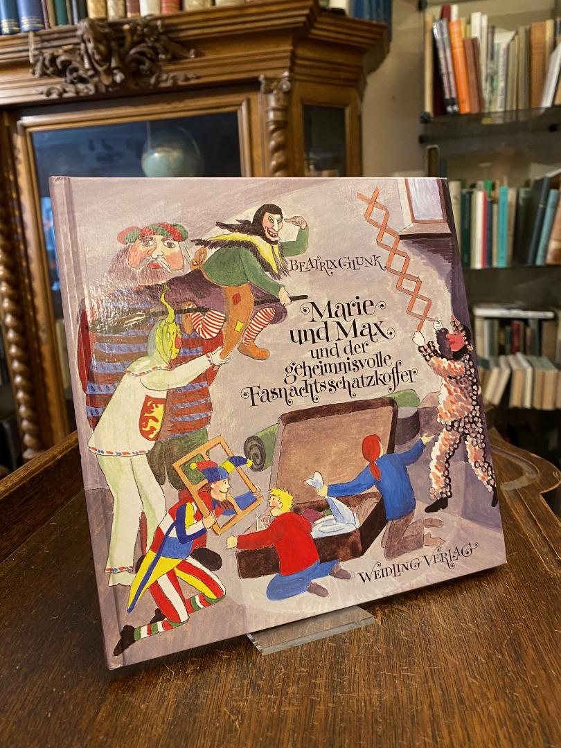 Glunk, Beatrix: Marie und Max und der geheimnisvolle Fasnachtsschatzkoffer : Geschichten für den Narrensamen gereimt und gemalt von Beatrix Glunk. (1. Aufl.), Stockach-Wahlwies, Weidling Verlag, (1998). 8° (20x20), 50 S., ganzseitige Illustrationen mit gegenüberstehenden lokalen Geschichten in Reimform, beidseitig farb ill OPbd, ohne Gebrauchsspuren, offensichtlich ungelesen,
