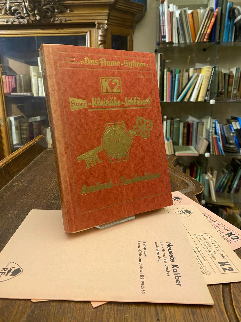Flume, Rudolf: Flume Kleinuhr Schlüssel K 2 1962/63 : Armband und Taschenuhren : Anschlußband zum Flume-Kleinuhr-Schlüssel 1958. Teil 1: Tabellen und Verzeichnisse. Teil 2: Kaliber-Liste mit den neuesten Kalibern, die bis Ende des Jahres 1962 erschienen sind und als Wiederholung alle bisher veröffentlichten Kaliber mit den neuesten Angaben über die Lieferungsmöglichkeit. Teil 3: Bild-Liste mit den Abbildungen der neuesten Werke, die nach Abschluß der Ausgabe 1958 auf den Markt gekommen sind. Berlin; Essen, Rudolf Flume, 1963. 8° (21x15), 32, 328, 128 S., mit zahlr. Tab. und Werkabb., farb OKart (Brosch) mit goldPräg, Rücken etwas aufgehellt, kaum gelesen, gutes sauberes Exemplar, [= Flume-System; K2], 4 Beilagen: Neueste Kaliber, die während des Druckes erschienen sind.– sowie die Nachträge 1966, 1967, 1968.–