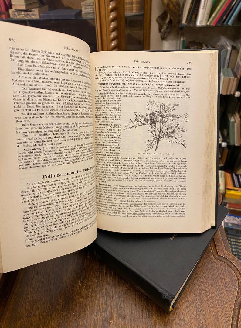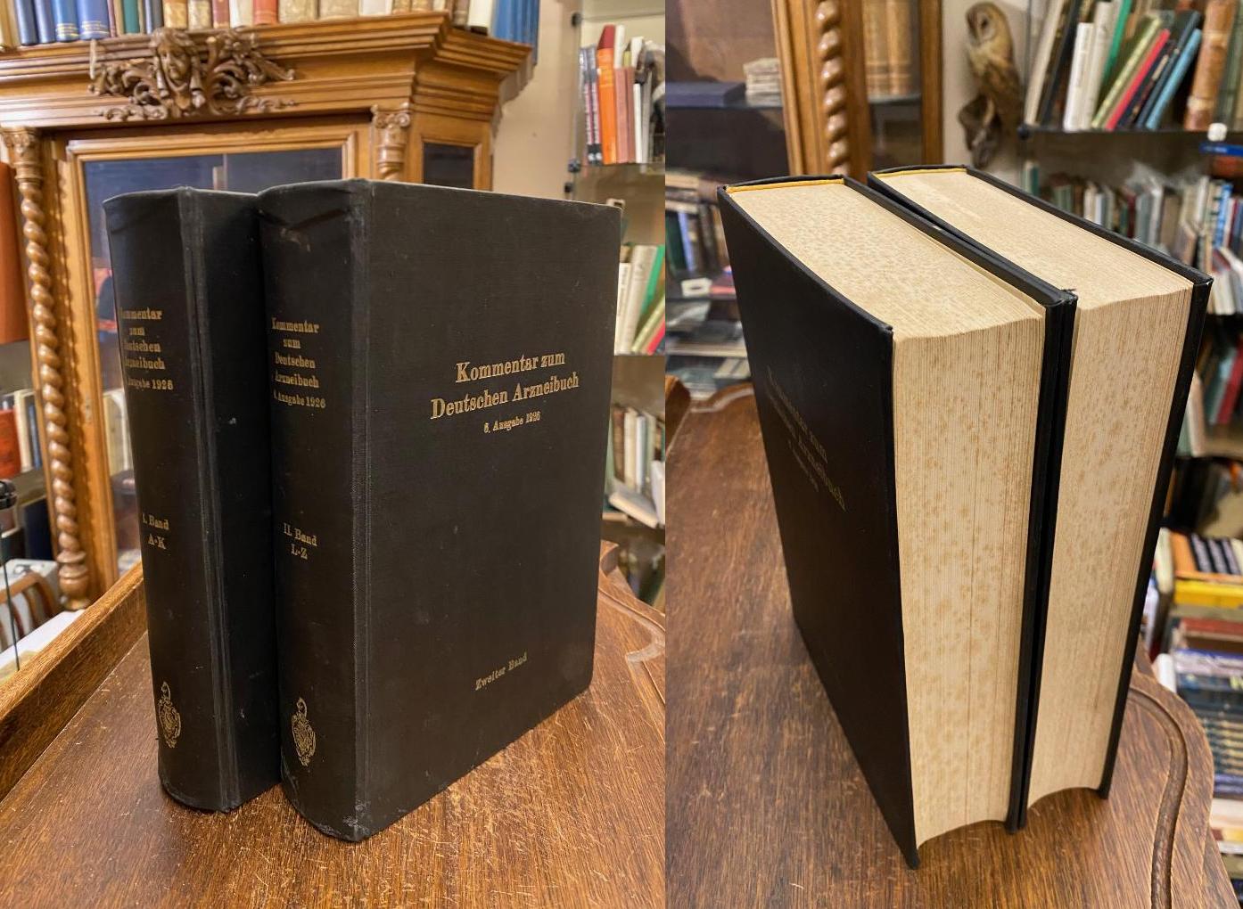 Pharmacopoe / Arzneibuch 1926. – Anselmino, [Otto] / Gilg, Ernst: Kommentar zum Deutschen Arzneibuch – 6. Ausgabe 1926 : Auf Grund der Hager-Fischer-Hartwichschen Kommentare der früheren Arzneibücher [in zwei Bänden]: BAND I: A – K + BAND II: L – Z. Unter Mitwirkung von Prof. Dr. W. Brandt, Frankfurt am Main, Dr. A. Braun †, Berlin, Dr. R. Brieger, Berlin, Priv.-Doz. Dr. H. Dieterle, Berlin, Priv.-Doz. Dr. R. Dietzel, München, Dr. W. Moeser, Darmstadt, Priv.-Doz. Dr. P. Schürhoff, Berlin, Dr. F. Stadlmayr, Darmstadt, Dr. O. Wiegand, Miltitz-Leipzig. 2 Bände in 2, Berlin, Verlag von Julius Springer, 1928. 4° (25x17), 2 Bl., 857 S., 1 Bl., 917 S., mit zahlr. Strukturformeln, sowie 269 + 165 Abb., schwarzer Olnbde gewachst mit goldPrägung, minimal berieben, Schnitte schwach stockfleckig, gute Exemplare, [= Deutsches Arzneibuch : Kommentar : 6. Fassung; DAB 6], [Kaiser/Buchge, Springer-Katalog; 4041].–