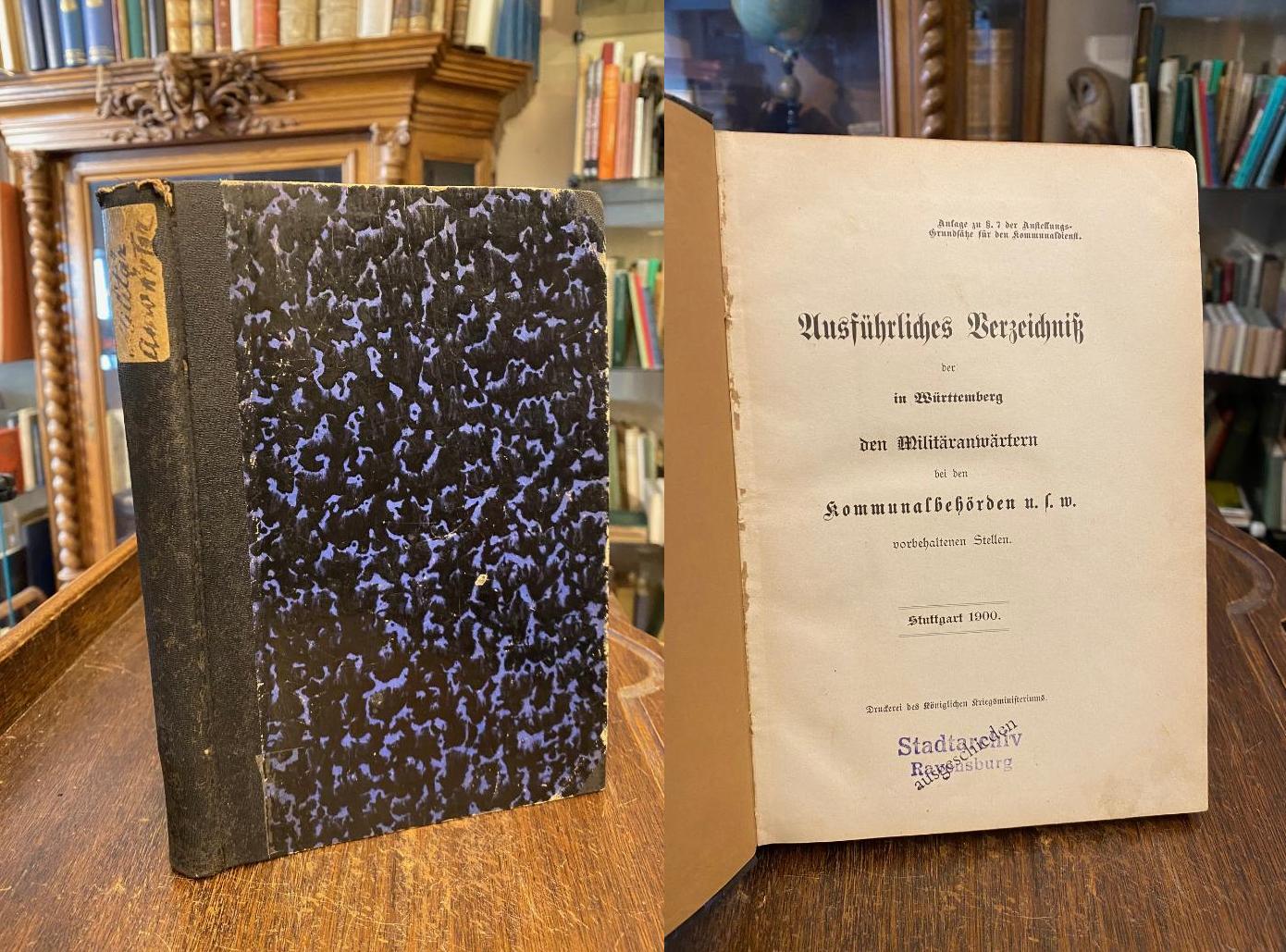 Ausführliches Verzeichnis der in Württemberg den Militäranwärtern bei den Kommunalbehörden u.s.w. vorbehaltenen Stellen : (Anlage zu § 7 der Anstellungs-Grundsätze für den Kommunaldienst) Stuttgart, Druckerei des Königlichen Kriegsministeriums, 1900. 8° (23x16), VI, 343 S., marmor Hln d.Zt. mit handschriftl Rückenschild, minimal berieben, Archivstempel auf Innenspiegel/Titelblatt, gutes Exemplar,