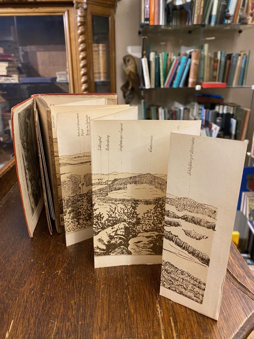 Hersbruck. – Elbinger, Thomas / Sartorius, Johann Baptist: Elbinger – Sartorius : Führer durch Hersbruck und Umgebung : Mit 1 Karte, 1 Panorama, 2 Orientirungskärtchen, 2 geologischen Profilen, 1 Tafel geognostischer Abbildungen und 2 Ansichten. 2., (aktualisierte und etwas erweiterte) Aufl., Nürnberg, Verlag der Friedr. Korn’schen Buchhandlung, 1894. kl8° (16x12), 246 S., mit 1 gefaltete Karte (Umgegend von Hersbruck), 1 Panorama (Vom Hansgörgl bei Hersbruck, ca. 130 cm), 2 gefaltete Orientierungskärtchenen (vom Rothenberg übersehbare Gegend, Hohenstein-Rundsicht), 2 mehrfach gefaltete geologischen Profile (I. Profil Steinensittenbach-Hohenstein-Hersbruck-Arzberg-Eismannsberg.– II. Röthenbach-Hersbruck-Sulzbach-Amberg), 1 Tafel geognostischer Abb. (7 Fossilien) und 2 Ansichten (Hersbruck vom Fuße des Buch aus gesehen’ als lithograph Frontispiz, ‚Kurhaus Rupprechtstegen‘ als fotograf Tafel), [so komplett], roter Oln gewachst mit goldTitel, Werbevorsatz, minimal angeschmutzt, hintere Rückenkanten etwas aufgeplatzt, kleine Besitzstempel verso Frontipiz und hint Innenspiegel, Panorama mit leichter Fehlfalzung, gutes und vollständiges Exemplar,