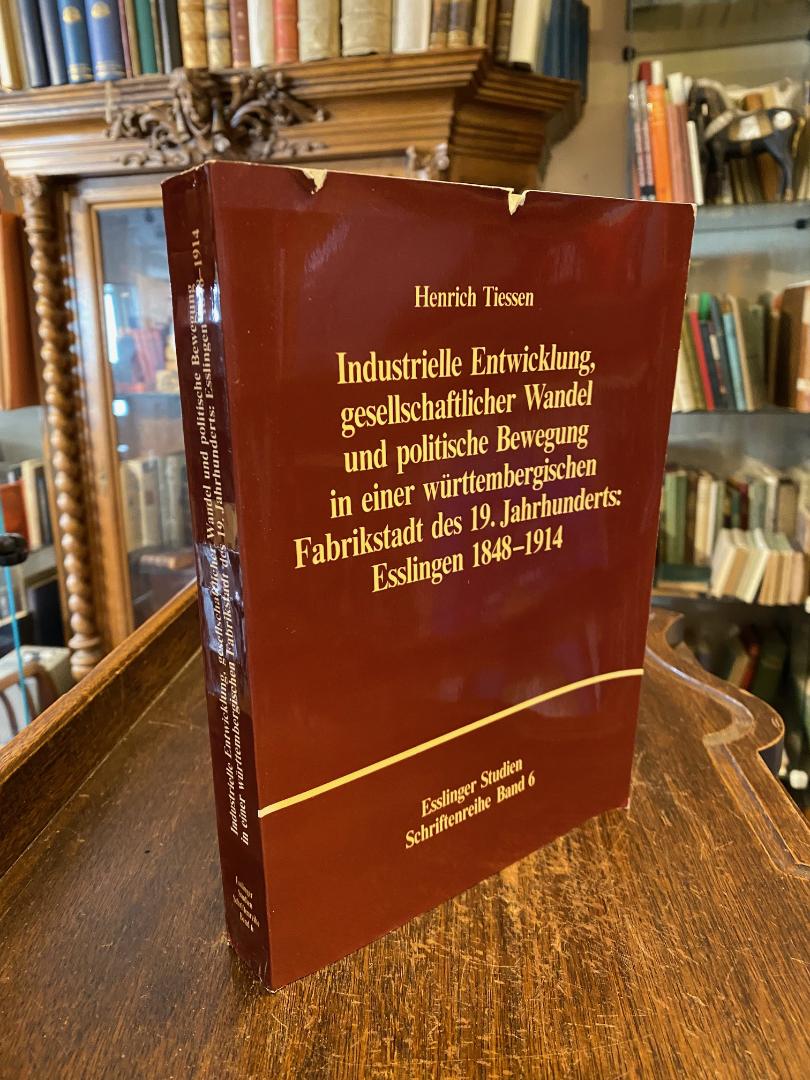 Esslingen. – Tiessen, Henrich: Industrielle Entwicklung, gesellschaftlicher Wandel und politische Bewegung in einer württembergischen Fabrikstadt des 19. Jahrhunderts: Esslingen 1848 – 1914. Ostfildern, Jan Thorbecke Verlag / Esslingen, Stadtarchiv, (1982). gr8° (24x17), 448 S., OKart (Brosch), Umschlagvorderseite kopfseitig etwas angestossen, kleiner Archivstempel auf Innenspiegel/Titel, sonst sauber und wohlerhalten, [= Esslinger Studien : Schriftenreihe; 6 : herausgegeben vom Stadtarchiv Esslingen : Schriftl. Walter Bernhardt],