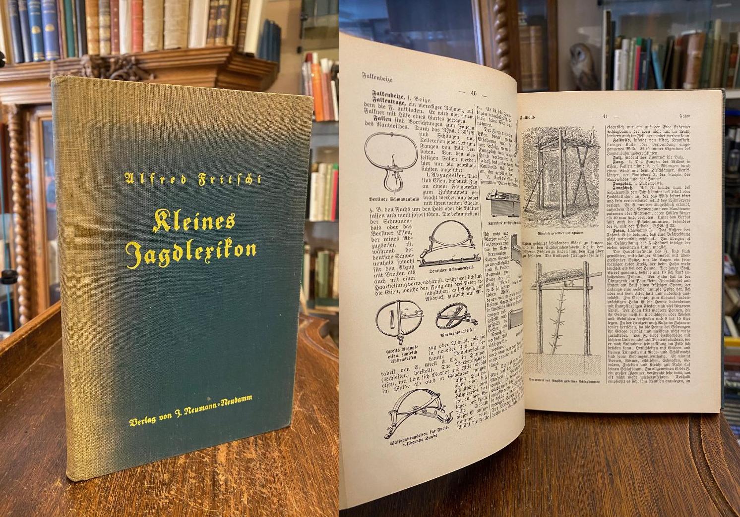 Fritschi, Alfred: Kleines Jagdlexikon : Kurzgefaßtes Nachschlagewerk für den Jäger unter Berücksichtigung der wichtigsten Bestimmungen des Reichsjagdgesetzes vom 3. Juli 1934, der Ausführungsverordnung vom 27. März 1935, der Ergänzungsbestimmungen und der Wildverkehrsordnung vom 21. März 1936 mit einem Anhang ‚Waidmannssprache‘. Neudamm, Verlag von J. Neumann, 1937. gr8° (23x16), 172 S., 2 Bl., mit zahlr. teils ganzeseitigen Abb. und 1 (von 2) gefalteten farb Tafeln, grüner Oln, Einband etwas lichtrandig, Jahreszahl auf Titel eingekreist, hinterer Innenspiegel mit Exlibris, es fehlt Bildtafel 2, sonst fest sauber und gepflegt,