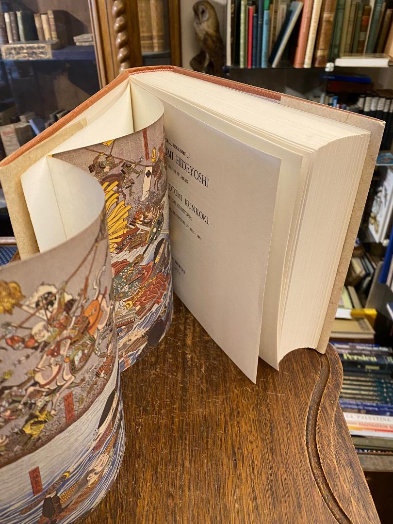 HIDEYOSHI Toyotomi (1537-1598). – KUNIYOSHI Ichiyusai (1797-1861): Pictorial Biography of Toyotomi Hideyoshi, the Unifier of Japan : Ehon Toxozomi Kunkoki, by Ichiyusai Kuniyoshi : From the Woodblock Edition of 1855 – 1884. Hollywood CA, W. M. Hawley, (1975) stamped by Hawley 1986. 4°oblong (22x29), 6, (3), 606 p., with folded color frontispiece and 606 b/w full page illustrations after woodblock prints (ukio-e), publishers red cloth gilt decorated with jacket, tight and clean, well cared, pictures are reduced 9% to fit on a standard size printing paper.–