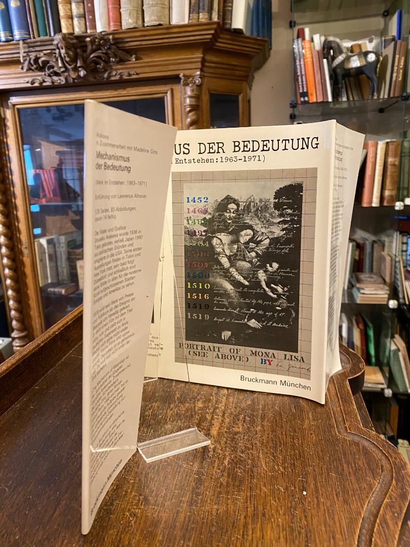ARAKAWA Shusaku (1936-2010). – Arakawa / Gins, Madeline / Alloway, Lawrence: Mechanismus der Bedeutung (Werk im Entstehen: 1963 – 1971) : Arakawa in Zusammenarbeit von Madeline Gins. Einführung von Lawrence Alloway. München, Verlag F. Bruckmann, (1971). 4° (25x24), 126 S., reich illustriert mit 83 (davon 14 farb) Abb., typographisch interessant, OPbd mit 2 ill OU, Umschlagrücken minimal lichtverfärbt, sonst tadellos, dazu der Original-Schuber (leicht lichtrandig und zart anschmutzt), Das Buch hat zwei Umschläge mit zwei unterschiedlichen Titelbildern, mit der Fragestellung: Inwieweit verändert sich die Bedeutung des Buches mit dem jeweilien Bezugsrahmen? Völlig?