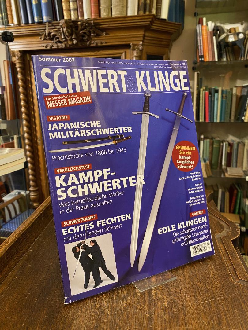 Wieland, Hans Joachim (Red): Schwert und Klinge : Ein Sonderheft von Messer Magazin : Titelthemen: Japanische Militärschwerter : Prachtstücke von 1868 bis 1945.– Vergleichstest Kampfschwerter : War kampftaugliche Waffen in der Praxis aushalten.– Kampfschwerter : Echtes Fechten mit dem Schwert). Bad Aibling, Wieland Verlag, (2007)., 4° (28x21), 98 S., reich illustriert, ill OKart (Brosch), geringe Lesespuren, fest und sauber, [= Messer Magazin; Sonderausgabe 3],