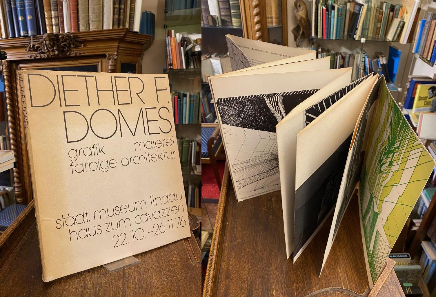 Domes, Dieter F. (1939-2016). – Schaugg, Gerhard (Text): Diether F. Domes : grafik – malerei – farbige architektur. (Publikation zur Ausstellung Städtisches Museum Lindau, Haus zum Cavazzen, 22. Oktober bis 26. November 1976). Lindau, Druckerei Paul (Druck), 1976. 4° (30x26), 13 Bl. (inkl Umschlag), mit ganzseitigen WerkAbb. und fotograf Aufnahmen, OKart (Brosch), als Leporello gebunden mit Umschlag Umschlag lichtverfärbt und na der unteren Rückenecke mit kleinem Abrieb, ordentliches Exemplar, mit einem Aufsatz von Gerhard Schaugg ‚ Bild-Fenster-Wand : Überlegungen zur Farb- und Formsprache des Diether Domes‘.–