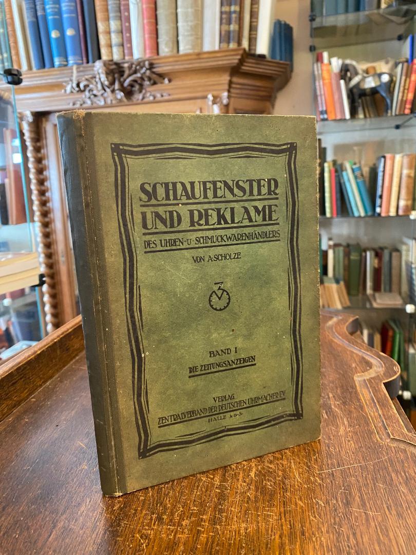 Scholze, A.: Schaufenster und Reklame des Uhren- und Schmuckwaren-Händlers : Erster Band: Die Zeitungsanzeigen. Halle (Saale), Verlag des Zentralverbandes der Deutschen Uhrmacher e. V., (1925). 8° (22x15), 180 S., mit 112 Abb. und ab S.123 zahlr. Anzeigen-Vorlagen, OHln, etwas angestaubt und berieben, Vorsätze angeschmutzt, teils etwas fingerfleckig, ordentliches festes Exemplar,