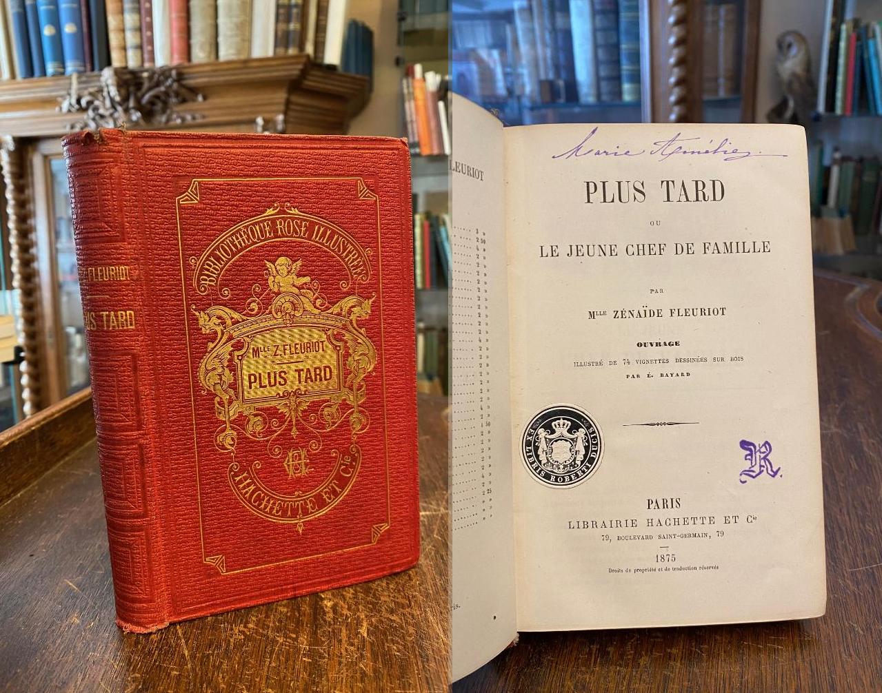 Fleuriot, Mlle Zenaide (1829-1890): Plus Tard ou Le Jeune Chef de Famille. Ouvrage illustre de 74 vignettes dessinees sur bois par [Emile] Bayard. Paris, Librairie Hachette, 1875. 8° (18x11), 299 p., reliure d’editeur rigide en toile rouge, riche decoration en or, tranches dorees, bon etat, [= Bibliotheque Rose Illustree], provenance: bibliotheque ducale de chateau Altshausen avec ex-libris de Robert Duc de Wurtemberg (1873-1947).– et nome manuscrite Marie-Amelie (c’est-a-dire sa soeur Marie Amelie de Wurtemberg (1865-1883)).–