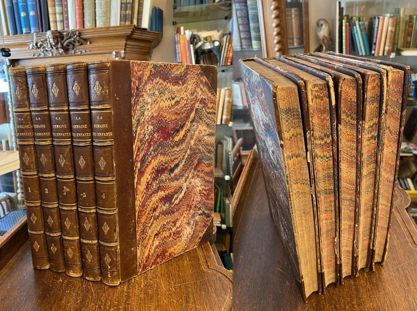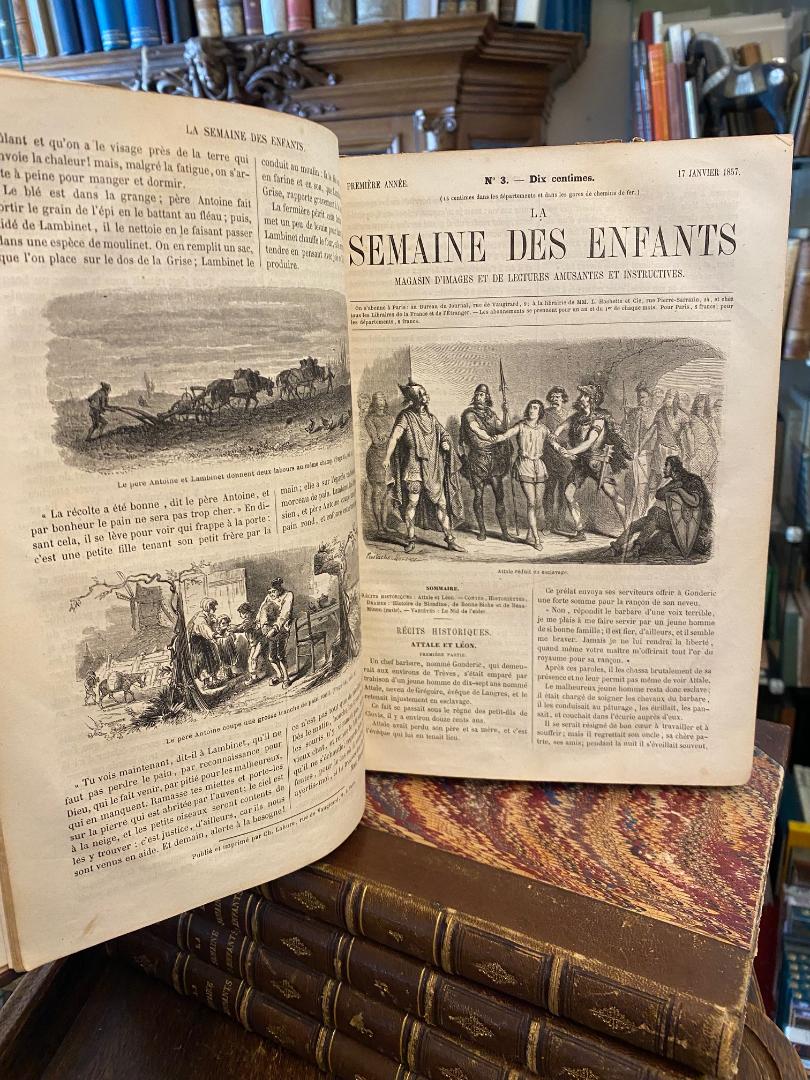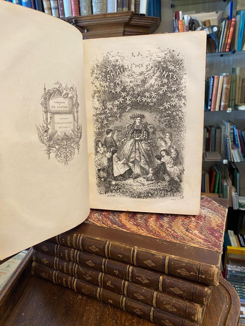 La Semaine des Enfants : 1. annee 1857 – 5. annee 1861 = Nr. 1 – 261 : Magasin d’Images et de Lectures Amusantes et Instructives. 5 vol, Paris, Ch. Lahure, 1857 – 1861. 4° (28x20), 415; 418; 423; 415; 415 p., avec nombreuses illustration gravures sur bois en partie par Gustave Dore, reliure d’epoche en demi cuir, doree sur dos, peu abrasion, feuilles 27-29 dans la 1. vol defectueux au bord, sinon tres bon, les cinq premieres annees complets d’une reliure uniforme contemporaine.–