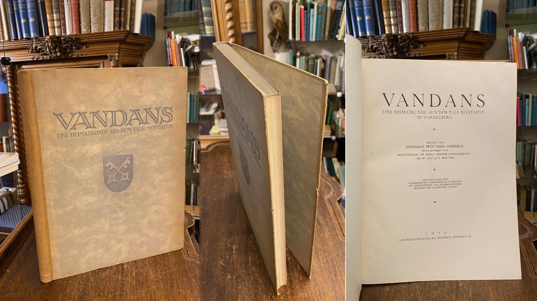 Barbisch, Hans: Vandans : Eine Heimatkunde aus dem Tale Montafon in Vorarlberg. Unter Mitarbeit von Adolf Helbok (Ortsgeschichte) und Leo Jutz (Mundart). Herausgegeben vom Vorarlberger Landesmuseum in Bregenz mit Unterstützung des Österreichischen Museums für Volkskunde in Wien. Innsbruck, Universitätsverlag Wagner, 1922. 4° (31x24), XV, 379 S., mit 93 Abb., OHln, minimale Kantenbestossung, leicht gebräunt, sauber und gepflegt,