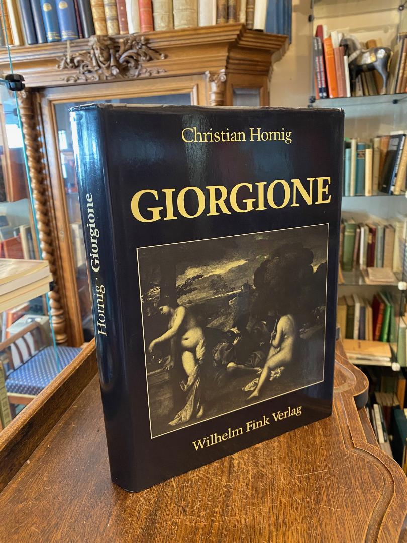 Giorgione da Castelfranco (1478-1510). – Hornig, Christian: Giorgiones Spätwerk. (Publikation zur Ausstellung Kusnthistorisches Museum Wien, 23. März bis 11. Juli 2004). München, Wilhelm Fink Verlag, 1987. 4° (30x22), 363, 75, XXVI S., mit zahlr. s/w-Werkabb. auf 100 Tafeln, Oln mit ill OU, Papier leicht gebräunt, kaum gelesen, sauber und wohlerhalten, enthält: I. Die Giorgione-Literatur bis heute.– II. Kategorien des Werkes.– III. Die Zuschreibungsfrage-Zwischenbilanz: Das Konzert im Louvre.– IV. Das Urteil Salomos in Kingston Lacy.– V. Die Adultera in Glasgow.– VI. Das Müchner Porträt.– VII. Der Seesturm in der Scuola di San Marco.– VIII. Ergebnisse der Untersuchung.– Appendix I-III.–