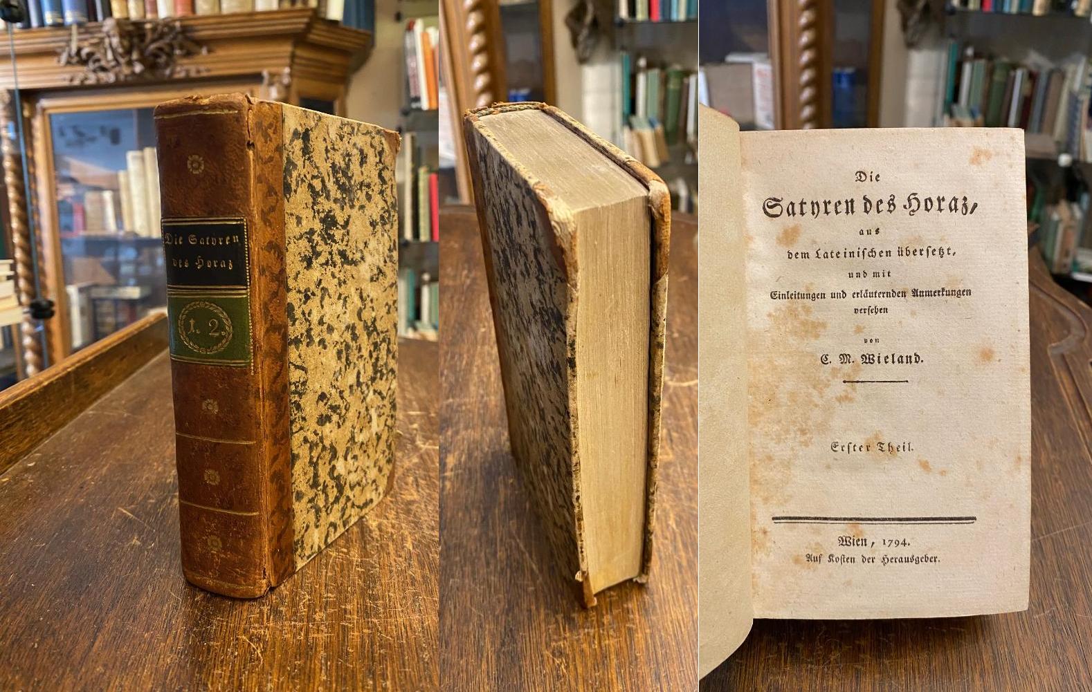 Horaz : Quintus Horatius Flacus (65v – 8v). – Wieland, Christoph Martin (Üb): Die Satyren des Horaz, aus dem Lateinischen übersetzt und mit Einleitungen und erläuternden Anmerkungen versehen von C. M. Wieland : Erster [und Zweyter] Theil. 2 Bände in 1 Band (so komplett), Wien, Auf Kosten der Herausgeber, 1794. kl8° (17x10), 286, 214 S., Hldr d. Zt. mit 2 geprägt RSchildern, goldRückenPrägung, KleisterppierVorsätze, Kapitale gering verletzt, Ecken etwas bestossen, alter Eintrag auf flVorsatz, Papier teils etwas stockfleckig, gutes solides Exemplar, [VD18 15639789].–
