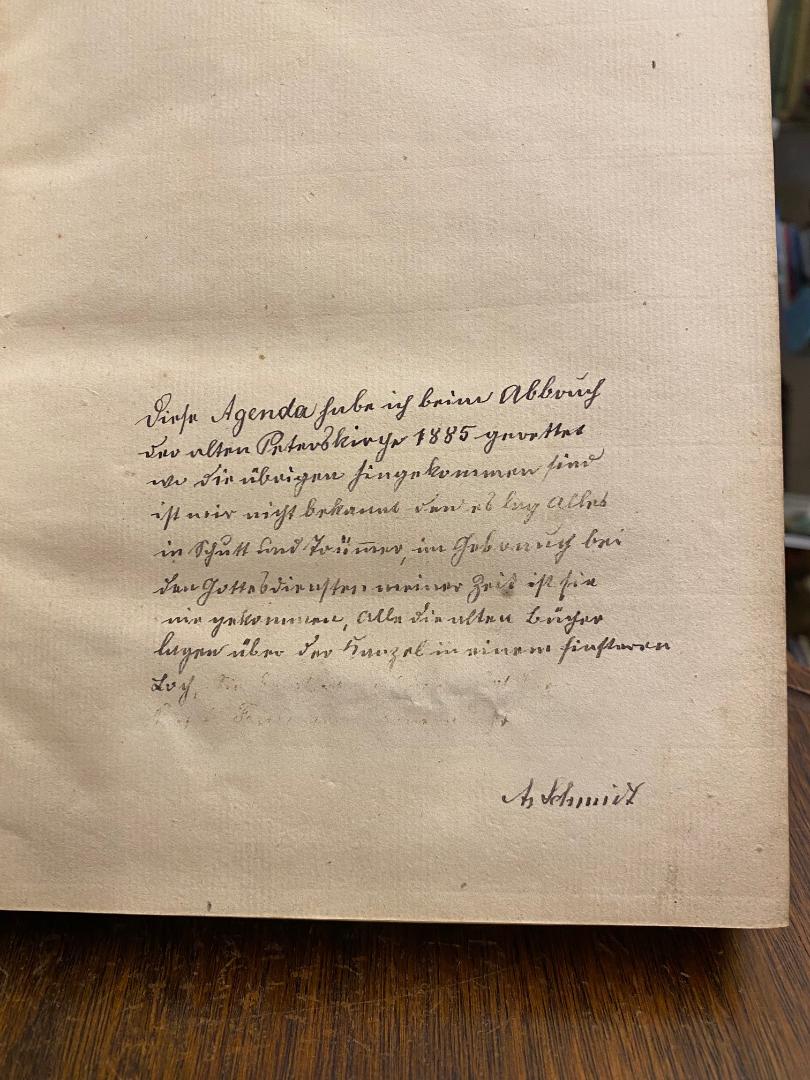 Agenda, Das ist: Kirchen-Ordnung, Wie sich die Pfarrherren und Seelsorger in ihren Aemtern und Diensten verhalten sollen. Für die Diener der Kirchen in Hertzog Heinrichs zu Sachsen, U.G.H. Fürstenthum gestelltet. Jetzo aufs neue aus Churfürst Augusti Kirchen-ordnung gebessert, auch mit vielen Collecten der Superintendenten, wie nicht weniger mit selbigen auf alle Wochen- Sonn- und Fest-Tage vermehret. [angebunden] Der kleine Katechismus, ohne und mit der Auslegung nebenst den Frag-Stücken und Haus-Tafel vor die Christliche Gemeine, gestellet durch D. Martin Luthern. Leipzig, Friedrich Lankisch, 1747. Leipzig, bey Friedrich Lanckischens Erben, 1748. 8° (21x17), 5 Bl., 258 S., 4 Bl.; 4 Bl., 56 S., (Katechismus) 6 Bl. (Kirchengebete), 40 S. (Eheordnung), mit mehreren Holzschnitt-Vignetten und mehreren Seiten Noten, roter Samteinband, dreiseitiger Goldschnitt, Kleisterpapier-Vorsätze, obKapital minimal verletzt, kaum genutzt, sauber und gepflegt, auf flVorsatz handschriftlicher Eintrag: ‚Diese Agenda habe ich beim Abbruch der alten Peterskirche [Leipzig] 1885 gerettet / wo die übrigen hingekommen sind ist mir nicht bekannt, denn es lag alles in Schutt und Trümmer, im Gebrauch bei den Gottesdiensten meiner Zeit ist sie nie gekommen. Alle die alten Bücher lagen über der Kanzel in einem finsteren Loch. A. Schmidt‘