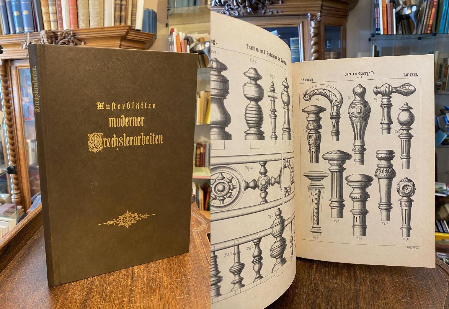 Graef, [August] / Graef, [Max] (Hrsg): Musterblätter moderner Drechslerarbeiten : Erste [und zweite] Sammlung : [mit je 32 Tafeln]. NACHDRUCK der 3., verbesserten Auflage, Weimar, Bernhard Friedrich Voigt, 1889 / 1895. 2 Teile in 1 Band, Hannover, Edition ‚libri rari‘ im Verlag Th.Schäfer, 1982. 4° (30x22), [76] S. [= 4 Bl., 32 Tafeln, 3 Bl., 32 Tafeln, 1 Bl.), brauner OKldr mit goldPrägung, Name auf Vortitelblatt, sauber und wohlerhalten,