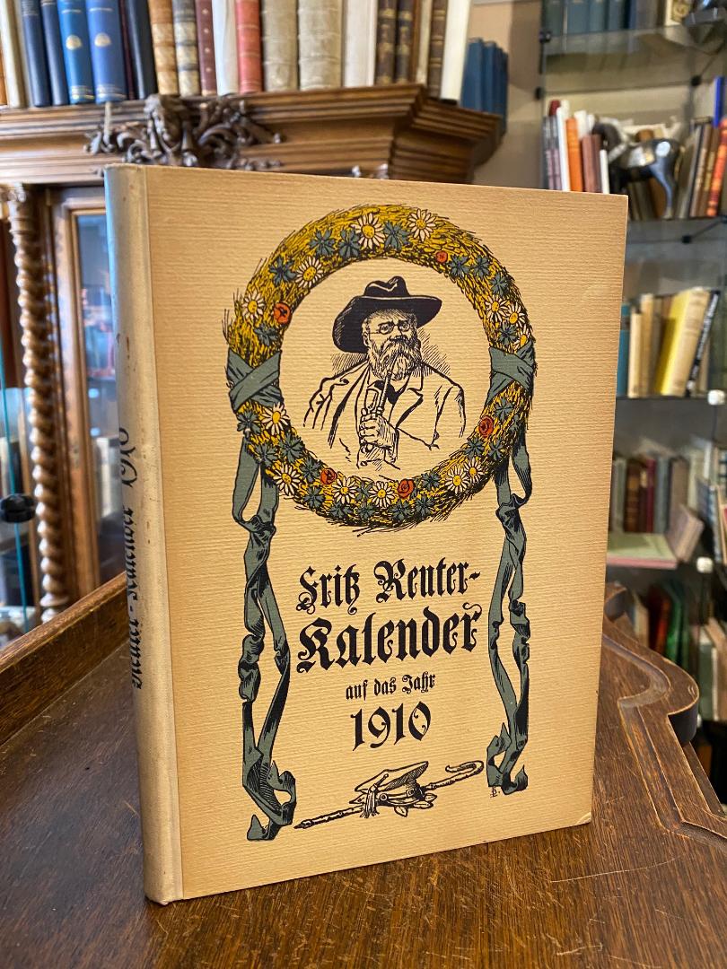 Reuter, Fritz : Kalender 1910 : Jg. 4. – Gaedertz, Karl Theodor (Hrsg): Fritz Reuter-Kalender auf das Jahr 1910 : Mit Schmuck und Illustrationen von Johann Bahr, Porträts gezeichnet von Fritz Reuter, einem handschriftlichen Scherzgedicht Reuters, sowie Abbildungen nach altem Original-Vorlagen und neuen Aufnahmen. Leipzig, Dietrich’scher Verlag : Theodor Weicher, 1909. gr8° (24x16), 106 S., 6 Bl., ill Hln, Name auf Vorsatz, ohne Gebrauchsspuren, frisch,