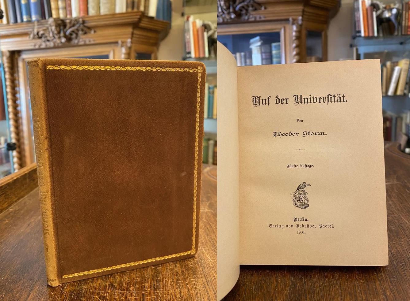 Storm, Theodor: Auf der Universität. 5. Aufl., Berlin, Verlag von Gebrüder Paetel, 1904. kl8° (16x12), 101 S., 1 Bl., brauner Oldr (Wildleder / Nubuk) mit beidseitigen Deckelfiletten, goldRückentitel, dreiseitiger Goldschnitt, Rücken berieben und etwas aufgehellt, alter Name auf Vortitel, sauber und wohlerhalten, [= Paetels Miniatur-Ausgaben-Kollektion],