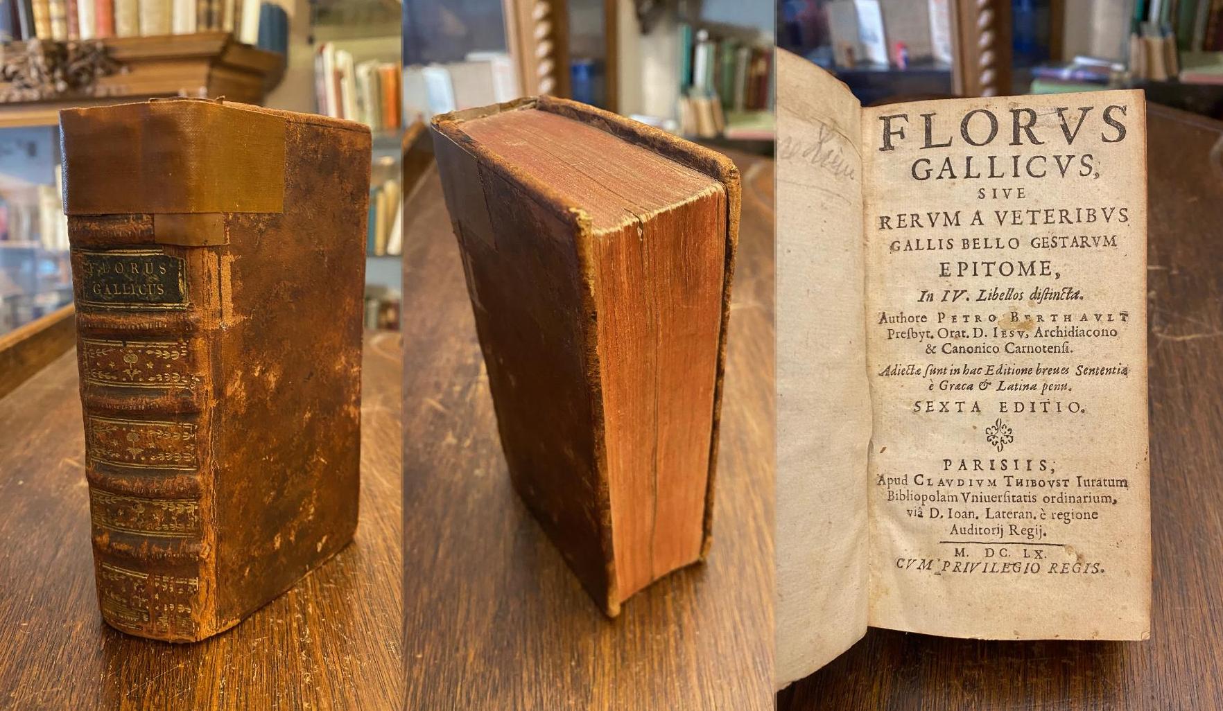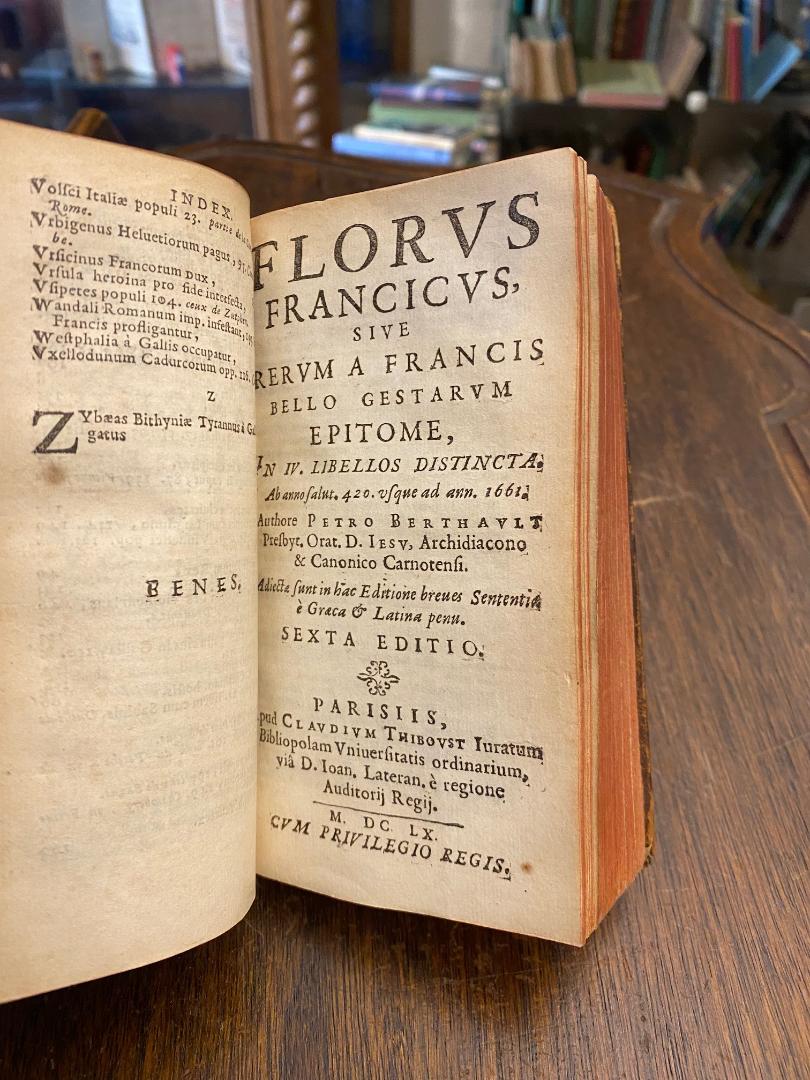 Berthault, Pierre (1600-1681): Florus Gallicus sive, rerum a veteribus Gallis Bello Gestarum Epitome, in IV. libellos distincta : Authore Petro Bertahault … Sexta Editio. [angebunden]: Florus Francicus sive, rerum a Francis Bello Gestarum Epitome, in IV. libellos distincta, ab anno salut. 420 usque ad ann 1661 : Authore Petro Bertahault .. 6. Aufl., 2 Bände in 1, Parisiis [Paris],. Apud Claudium [Claudius] Thiboust / Paris, Typis Petri [Petrus] Variquet (Druck), 1660. 12° (15x18), [21] Bl., 244 S., [12] Bl.; [20] Bl., 426, [17] Bl., Ldr d.Zt. mit geprägt RSchild und RückengoldPrägung, Rotschnitt, marmorVorsätze, Leder berieben, Rücken kopfseitig alt mit braunem Klebeband verstärkt, fest und sauber, [vgl. VD17 23:311686B / 27:731912G für Kölner Ausgaben der Florus Francicus].–