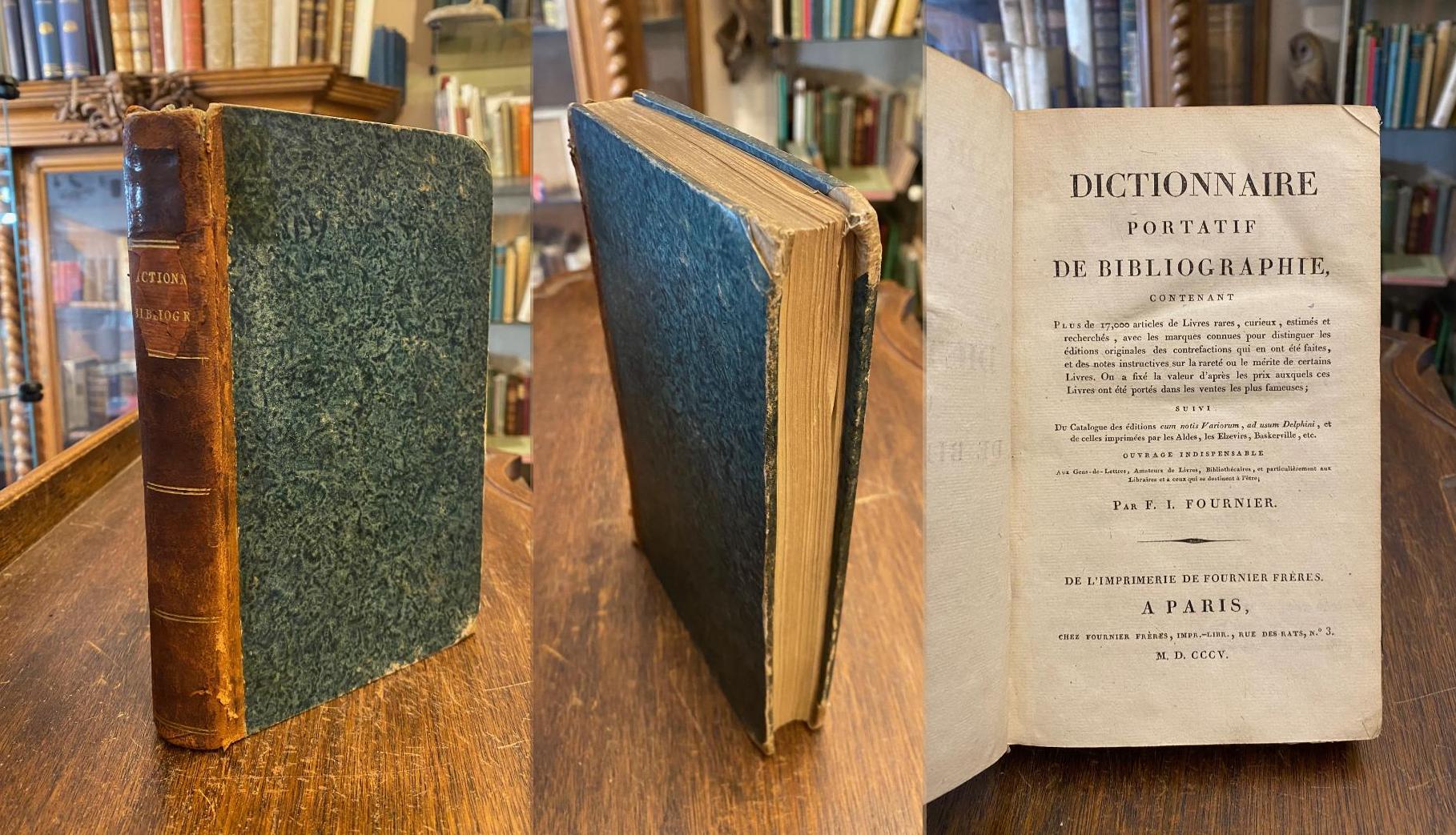 Fournier, F. I.: Dictionnaire portatif de Bibliographie, contenant plus de 17000 articles de livres rares, curieux, estimes et recherches, avec les marques connues pour distinguer les editions originales des contrefactions qui en ont ete faites, et des notes instructives sur la rarete ou le merite de certains Livres. On a fixe la valeur d’apres les prix auxquels ces Livres ont ete portes dans les ventes les plus fameuses. Suivi du catalogue des editions cum notis Variorum, ad usum Delphini, et de celles imprimees par les Aldes, les Elzevirs, Baskerville, etc. Ouvrage indispensable Aux Gens de Lettres, Amateurs de Livres, Bibliothecaires, et particulierement aux Libraires et a ceux qui se destinent a l’etre. (1. ed-), Paris, Fournier Freres, 1805. 8° (21x13), viii, 404, (1) p., reliure d’epoche en demi cuir, dos et piece de titre endommage, quelques plis dans les coins, propre et solide,