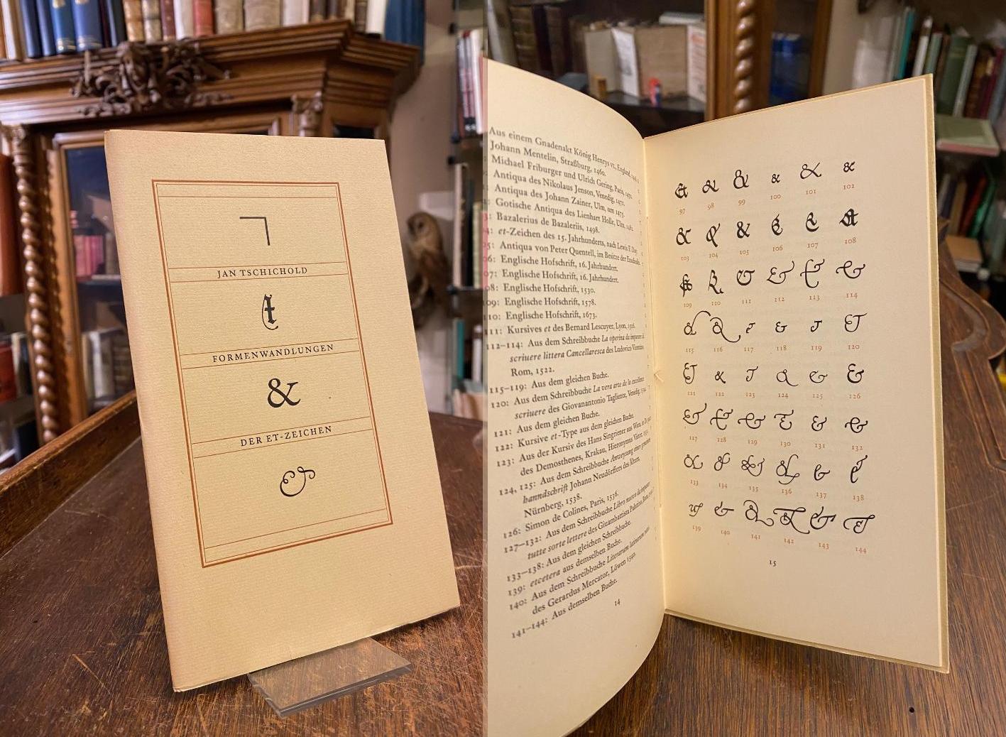 Tschichold, Jan: Formenwandlungen der & (et) Zeichen. (1. Aufl.), Frankfurt/M, D. Stempel, (1953). 8° (21x12), 24, (2) S., OKart (englOBrosch), tadellos, Die vorliegende Schrift wurde auf der Linotype aus Janson-Antiqua und Janson-Kursiv der Stempel AG Frankfurt 1953 nach Angaben des Verfassers gesetzt. Illustriert mit 288 Varianten des &-Zeichen.–