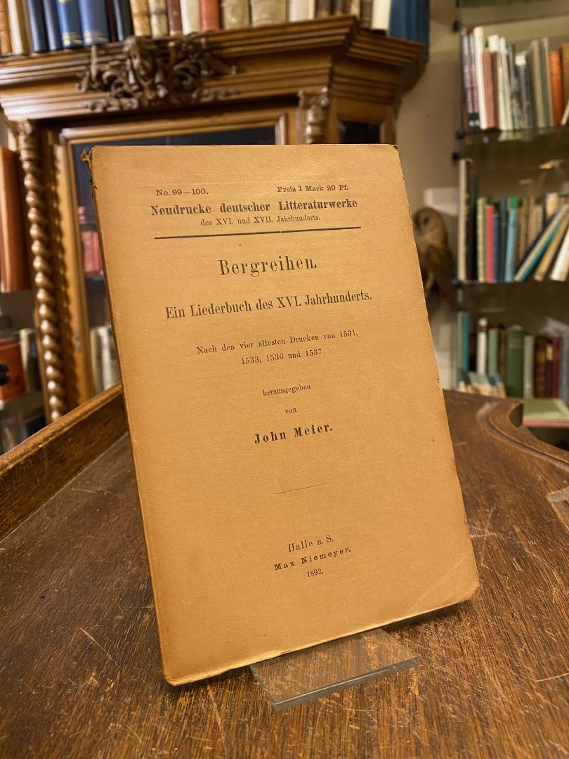 Meier, John (Hrsg): Bergreihen – Ein Liederbuch des XVI. Jahrhunderts : Nach den vier ältesten Drucken von 1531, 1533, 1536 und 1537. Halle a. Saale, Max Niemeyer, 1892. 8° (19x12), XVI, 122 S., OKart (Brosch), zweiseitig unbeschnitten, Titel gebräunt, sauber, [= Neudrucke deutscher Litteraturwerke des XVI. zbd XVII. Jahrhunderts; 99-100], Der Bergreihen (mittelhochdeutsch reie = Tanzlied, Reigen, auch Berglied, Berggesang, Bergmannslied) ist eine Form des ständischen geistlichen oder weltlichen Volkslieds der Bergleute.–