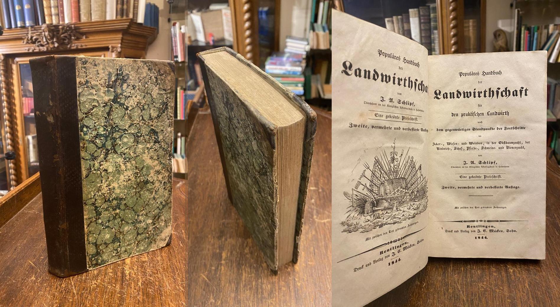 Schlipf, [Johann Adam]: Populäres Handbuch der Landwirthschaft für den praktischen Landwirth nach dem gegenwärtigen Standpunkte der Fortschritte im im Acker-, Wiesen- und Weinbau, in der Obstbaumzucht, der Rindvieh-, Pferde-, Schweine- und Bienenzucht von J. A. Schlipf, Oberlehrer an der Königlichen Ackerbauschule in Hohenheim. Eine [von der im Jahre 1840 in Brünn abgehaltenen Versammlung deutscher Lande- und Forstwirthe] gekrönte Preisschrift. Mit zwischen den Text gedruckten Zeichnungen. 2., vermehrte und verbesserte Aufl., Reutlingen, Verlag von J. Cr. Mäcken, 1844. 8° (22x14), XVI, 512 S., mit vereinzelten TextAbb., marmor Hldr d.Zt. ohne Rschild, berieben und bestossen, alter Name auf Vorsatz, innen fest und sauber, [Dochnahl, Bibliotheca Hortensis; 141],