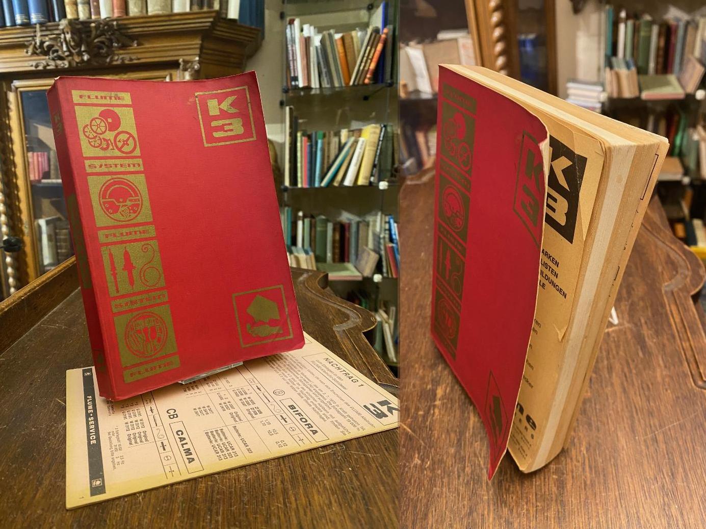 Flume, Rudolf: Flume Kleinuhr Schlüssel K 3 : Ausgabe 1972 : Fabrikmarken, Kaliber-Listen, Werkabbildungen, Einzelteile, Tabellen für Armbanduhren, Taschenuhren, Automatiks, Elektr. Uhren, Quarzuhren, Chonographen, Stoppuhren, Armband-Wecker. Berlin; Essen, Rudolf Flume, 1972. 8° (21x15), 48, 208, 320 S., DAZU: Nachtrag K3 zum Einlegen in den Flume-Kleinuhr-Schlüssel, roter OKart (Brosch) imprägniert mit goldPräg etwas angestaubt, Ecken gering bestossen, vorderer Umschlag mit Eckknick, die ersten 2 Blatt eckknittig, gutes Exemplar, [= Flume-System; K3],