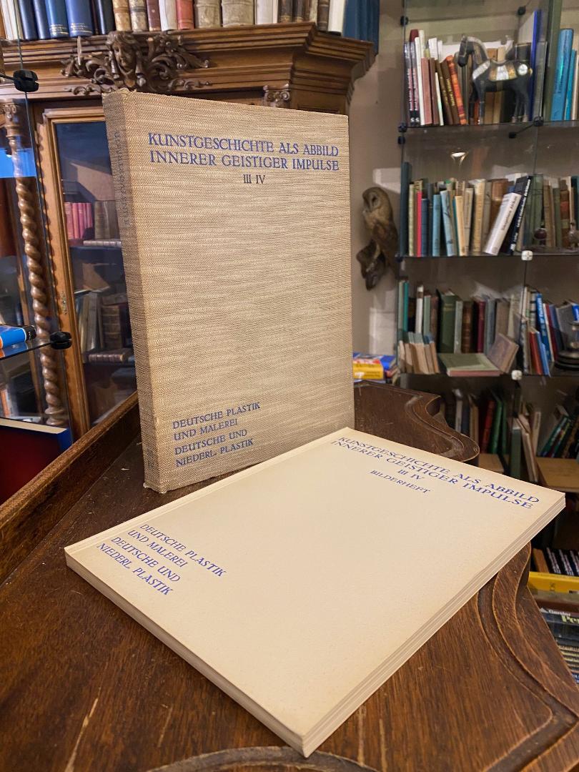 Steiner, Rudolf: Kunstgeschichte als Abbild innerer geistiger Impulse : Band II/IV: III. Vortrag: Grundlagen zum Verständnis des mitteleuropäisch-nordischen Kunstimpulses, Gegensatz und Zusammenhang der mitteleuropäisch-nordischen und der südlichen Kunst: Deutsche Plastik und Malerei bis zu Dürer und Holbein (Raffael). Mit 70 Bildbeigaben (Bilderheft III). IV. Vortrag: Das selbstständig Großartige des nördlichen Kunstschaffens neben der Renaissance-Kunst Italiens: Deutsche und Niederländische Plastik (Michelangelo). Mit 72 Bildgaben (Bilderheft IV). Basel, Verlag Zbinden & Hügin, 1940. 4° (30x21), 36, 27 S. + Bilderheft II/IV in Rückentasche (so komplett), Oln, Rücken mit winziger Verletzung, sauber und wohlerhalten, [= Kunstgeschichte als Abbild innerer geistiger Impulse : Dreizehn kunstgeschichtliche Vorträge gehalten am Goetheanum Dornach/Schweiz 1916/17 an Hand von Lichtbildern von Dr. Rudolf Steiner ; Anhang: Zwei Einzelausführungen aus den Jahren 1915 und 1923 in dreizehn Bänden mit über 700 Bildbeigaben; BAND 3 / 4],