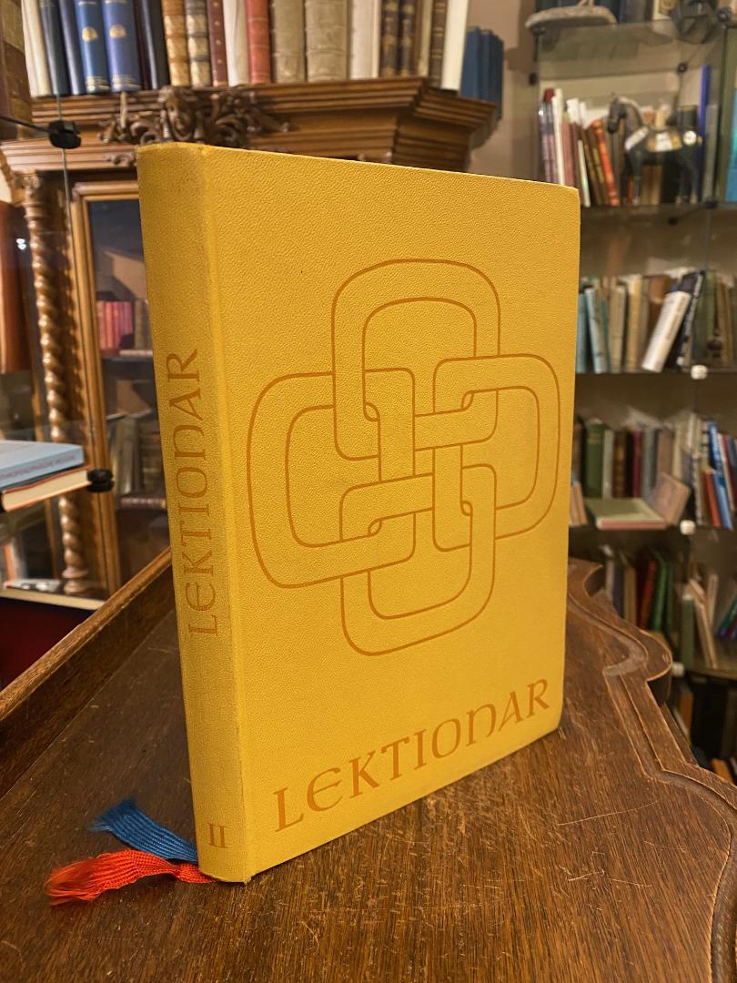 Die Feier der Heiligen Messe : Lektionar: Band II : Lesejahr B : Die Schriftlesungen für die Sonn- und Feiertage des Kirchenjahres. Einsiedeln und Köln, Benziger / Freiburg und Basel, Herder / Regensburg, Friedrich Pustet / Wien, Herder / Salzburg, St. Peter / Linz, Veritas, 1969. 4° (26x18), 336 S., gelber OKldr mit Prägung, 2 Lesebändchen, Schnitt etwas angestaubt, Stempel auf Vorsatz, fest sauber und gepflegt, [= Lektionar II : herausgegeben im Auftrag der Bischofskonferenzen Deutschlands, Österreichs und der Schweiz und des Bischofs von Luxemburg], Die Bibellesungen für das Lesejahr B.– In der von Alfred Riedel gestalteten Adamas Antiqua.–