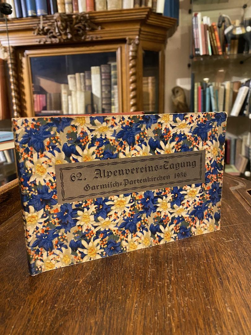 62. Alpenvereins-Tagung Garmisch-Partenkirchen 1936. Wien, Alpiner Verlag / Horn, Ferdinand Berger (Druck), 1936. 8°quer (13x19), [7 (Programm, Hütten-Verzeichnis, Bergführer-Verzeichnis, 12 (Das Werdenfelser Land in 12 Bildern nach Künstler-Federzeichnungen von Franz Bilko), 14 (Werbung)] Bl., Enzian-geblümter OKart (Brosch) mit montiertem silbernen Titelschild, Ecken minimal berieben, sauber und wohlerhalten,
