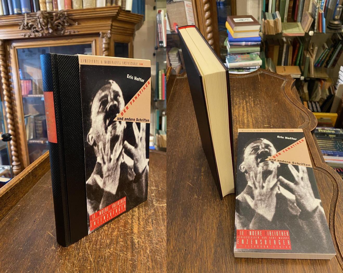 Andere Bibliothek 180. – Hoffer, Eric: Der Fanatiker und andere Schriften. Aus dem Englischen von Christoph D. Maucy, Wolfram Wagmuth und Wolfgang Heuer. Mit einem Nachwort von Wolfgang Heuer. 1. Aufl. (1.-7.Tsd.), Frankfurt/M, Eichborn Verlag, 1999. 8° (22x12), 306 S., 3 Bl., schwarzer OPbd mit Blindprägung, mit RSchild, Lesebändchen, mit ill Schuberstreifen, nahezu ungelesen, schönes gepflegtes Exemplar, [= Die Andere Bibliothek; 180 : herausgegeben von Hans Magnus Enzensberger], nummeriertes Exemplar 4563.–