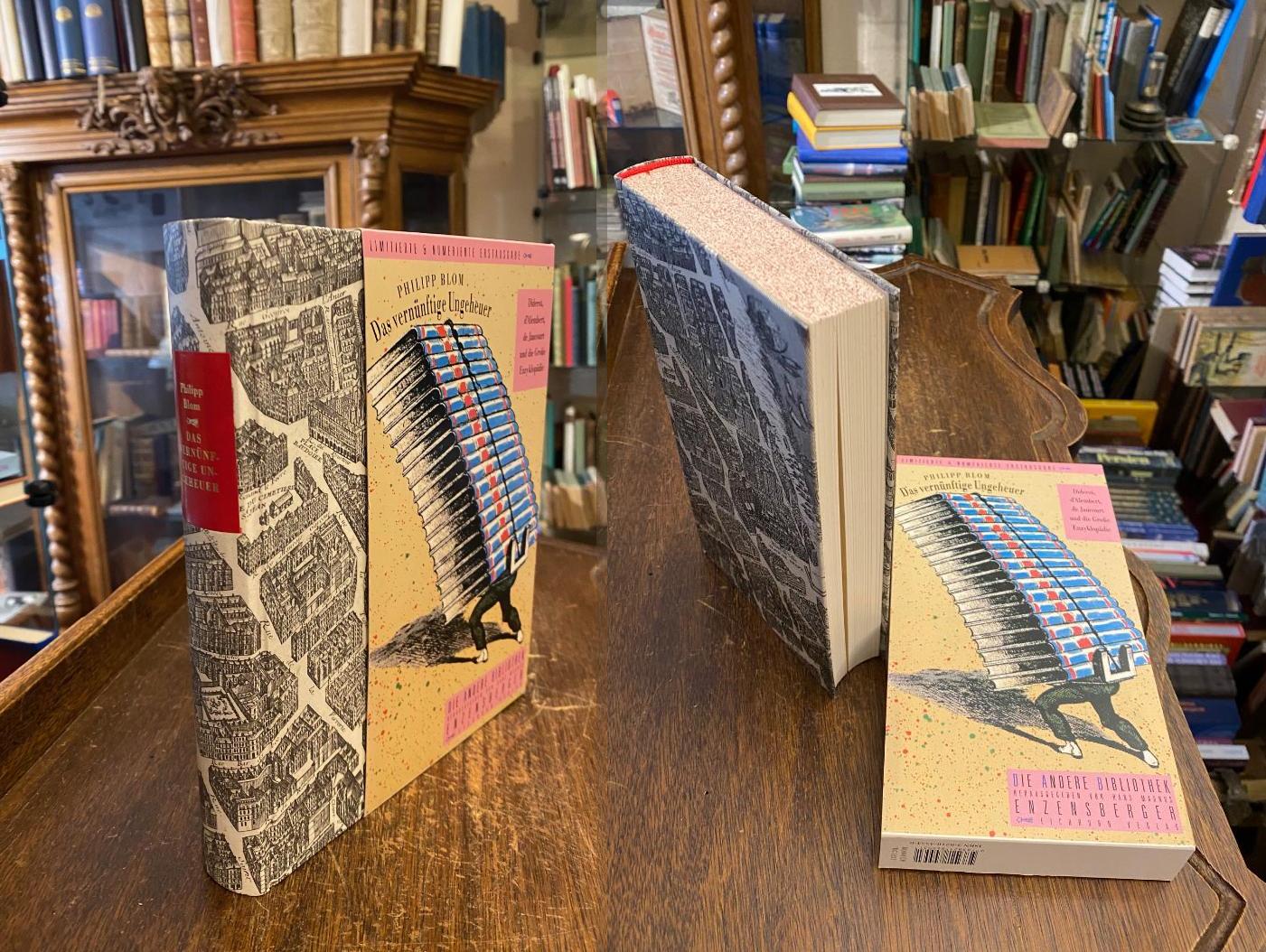 Andere Bibliothek 243. – Blom, Philipp: Das vernünftige Ungeheuer : Diderot, D’Alembert, De Jaucourt und die Grosse Enzyklopädie. Aus dem Englischen von Michael Bischoff. 1. Aufl. (1.-7.Tsd.), Frankfurt/M, Eichborn Verlag, 2005. 8° (22x12), 465., 3 Bl., mit Abb., ill OPbd, LdrRückenschild, Lesebändchen, mit ill Schuberstreifen, ohne Gebrauchsspuren, frisch, [= Die Andere Bibliothek; 243 : herausgegeben von Hans Magnus Enzensberger], nummeriertes Exemplar 6663.–