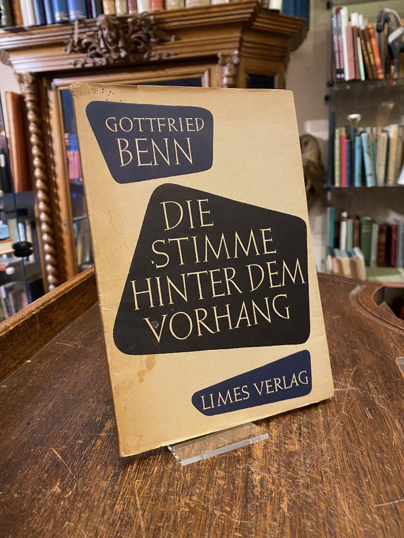 Benn, Gottfried: Die Stimme hinter dem Vorhang. 3. Aufl. (6.-8. Tsd.), Wiesbaden, Limes Verlag, 1957. 8° (20x14), 48 S., OKart (Brosch), Umschlag etwas angeschmutzt, ordentliches Exemplar, Umschlag von Adolf Hiort.–
